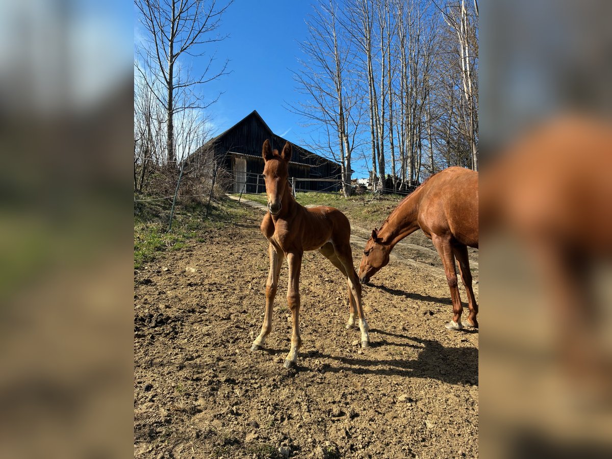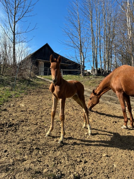 Zum Verkauf steht ein elegantes, langbeiniges und vielversprechendes AWÖ Stutfohlen, geboren am4.4.2026. Sie beeindruckt nicht nur durch ihr modernes Äußeres sondern auch durch ihr korrektes Fundament. Sie präsentiert sich mit viel Ausdruck und mit Antritt, der Motor sitzt wo er hingehört. Sie wird sicherlich ein ideales Damenpferd und gehobenes Freizeitpferd. Sie findet jeden Tag mehr Freude an den Kuschel- und Streicheleinheiten und wenn sie nach der Mama und ihrem Bruder kommt, dann wird sie schon sehr bald diese richtig einfordern. Auch die Mutter Dorothea ist eine total zugewandte, verschmuste und menschenbezogene Stute. Ihr Bruder wurde 3 Jährig ECVM frei geröntgt, sowie konnte er Lehrbuchmäßige Rückenbilder vorzeigen. Auch die restlichen Röntgen waren unauffällig. Geschätztes Endmaß +- 1,65 m, im mittleren Rahmen stehend Bei der Abgabe im Herbst 2026 kennt sie das Fohlen ABC, stand schon mehrmals am Hänger, kennt große Maschinen wie Traktoren, Kinder, Rinder, Hunde usw. Unsere Fohlen wachsen artgerecht in der Gruppe mit Gleichaltrigen auf. Wir freuen uns darauf, diesen besonderen Nachwuchs aus unserer privaten kleinen Eigenzucht persönlich vorzustellen. Ihr Vater Tesoro(Prämienhengst) beeindruckte bei der Körung mit einer taktvollen, aus dem aktiven Hinterbein und durch den Körper arbeitender Trabmechanik sowie seine bergauf gesprungene Galoppade. Der stets taktreine und raumgreifende Schrittzählt zu seinen Stärken. Ein großrahmiger, im Habitus eines Vererbers stehender Hengst mit einem überaus ehrlichen und charmanten Interieur. Auch nun unter dem Sattel ist dieser Junghengst (2022) mit viel Energie und Motivation gesegnet und bringt das Talent für den großen Sport mit. Väterlicherseits führt Tesoro in der zweiten Generation das Blut des bewährten Totilas, der 49 gekörte Söhne sowie zahlreiche Grand Prix erfolgreiche Nachkommen brachte. Der Muttervater Vitalis verbucht unzählige, gekörte Söhne und ist als Sportpferdevererber eine sichere Bank. Aus dem Stutenstamm der Abadonda stellte die 2. Mutter Roberta K in der Anpaarung mit Fürstenball den zweimaligen Finalisten der Weltmeisterschaften der jungen Dressurpferde „Nexolia Feodoro“.Ebenso ist Tesoro´s Mutter die Schwester zur Herwart von der Decken – Schau Siegering 2016 „Black Baccara“ von Bon Bravour und Schwester zur Mutter des2023 in Hannover gekörten Hengstes „Vulcan“ von Vitalis x Fürst Romancier. Tesoro absolvierte seinen VA-Test Ende Januar 2026 in Vechta mit einer 8,01, wo er für den Schritt die Tageshöchstnote 8,8 bekam. Die Mutter Dorothea wird von mir freizeitmäßig geritten. Sie führt über ihren Vater Quel Plaisir das Blut des Quantensprung. Quel Plaisir ist selbst in der Schweren Klasseangekommen. Quantensprung ist selbst bis Inter II (S***) erfolgreich. Vater etlicher gekörter Söhne, sowie S-erfolgreicher Nachkommen. Er qualifizierte sich mehrfach fürs Bundeschampionat in jungen Jahren und wurde 3. bei den Weltmeisterschaften der jungen Dressurpferde 2015.2013 beendet Quantensprungseinen 30-Tage-Test mit der Note 9,75 für die Rittigkeit im Fremdreiter-Test, sowie Höchstnoten für die Grundgangarten und das Interieur. Der Muttervater Glock’s Zonik N.O.P., der mit Zack, Romanov und Don Schufro die in der dänischen Zuchteinflussreichsten Hengste vereinte, gewann unter Edward Gal/NED bei der EM in Rotterdam/NED Teamsilber und belegte im Special und der Kür die Plätze acht und sechs. Zu seinen Nachkommen zählen amtierende Doppel-Europameister und Aachen-Sieger Zonik Plus/Justin Verboomen/BEL sowie die ebenfalls Grand Prix-erfolgreichen Zhaplin Langholt/Charlotte Jorst/USA, Zonik Hit/João Pedro Moreira/POR und die in der Kleinen Tour platzierten Zaeta de Malleret/Helen Langehanenberg, Zonella/Lauren Baggett/USA und Zum Glück RS2 OLD/Robin vanLierop/NED. Die dritte Mutter stammt von Donnerschwee ab, dieser startete als hocherfolgreicher Dressurhengst auf Landes- und Bundeschampionaten bis zur Klasse S, Grand Prix und Inter I.