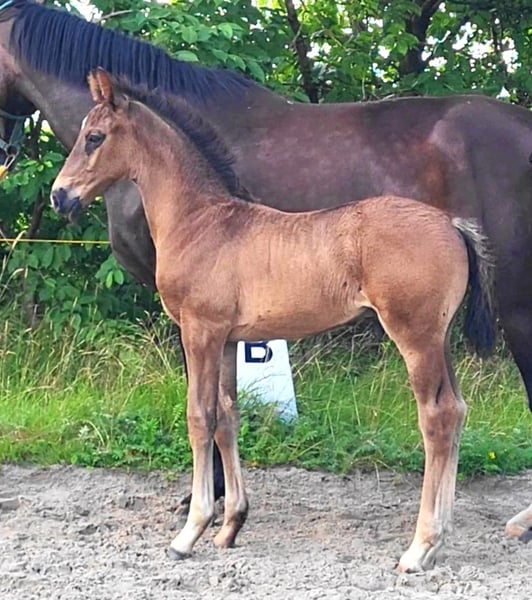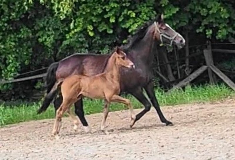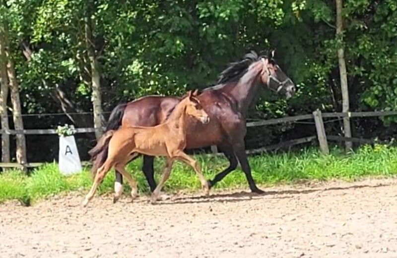 Expressive, very typy, long-legged colt with 3 very good, elastic basic gaits. Very correct and equipped with a lot of stallion presence. The foal is halter-trained, loading-friendly, and people-oriented. The mother: State premium and elite mare Olanda T by Florencio/ Waikato/ Kromprinz XX has completed an excellent performance test and was successful in sport until her breeding career: won and highly placed in riding horse tests and dressage horse A level. From the pairing with Don Romantic come the sport-successful horses Oktavia TB: victorious in dressage horse M at the age of 5 and Dopamin: victorious in M and S dressage at the age of 7. From this lineage come, among others, the Grand Prix horses: Falcao OLD (Victoria Max-Theurer) and Lamarc WRT (Sabine Becker), as well as the licensed stallion For Edition (HLP winner).