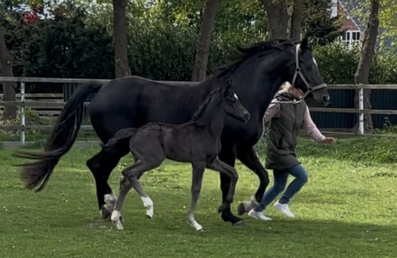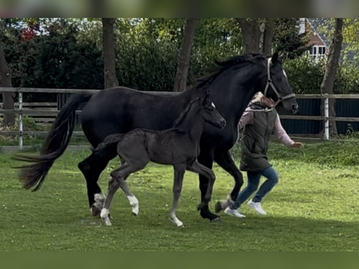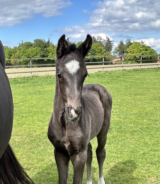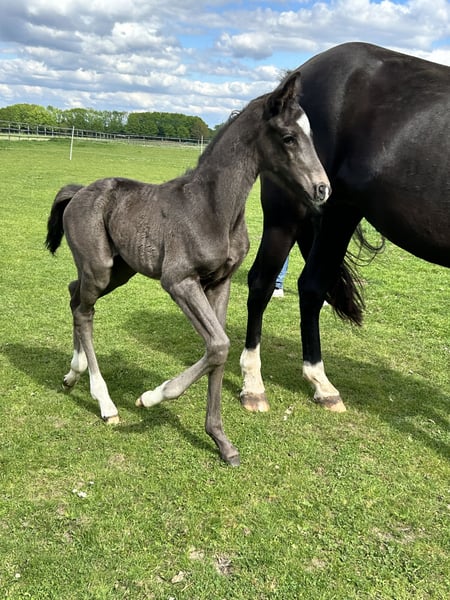 For sale is a typy, strong-moving Oldenburg colt in black color. Born on April 25, 2025 Sired by Bon Esprit (Champion Stallion 2023 / Gut Schönweide) out of a dam by Dante Weltino x Depardieu. The pedigree already shows the best prerequisites for a first-class future in the dressage arena. This colt impresses with very good movement quality, a lot of charm, and an excellent type. From this lineage, countless highly placed riding horses and licensed stallions have already been produced. The uncle is the licensed stallion Forever (descended from FollowHim Schönweide). A real eye-catcher with potential for training and competition career. If interested, we look forward to your message here or by phone: 0171-5621494