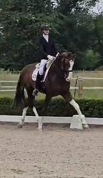Ein Traumhengst in Choccofuchs mit viel weiß Er ist 2017 geboren, 1,74m groß und mehrfach M* siegreich und M** platziert (2.Platz). Er beherrscht schon einige S Lektionen Es ist eine Freude ihn zu reiten. Bei ihm kommt viel Kraft von hinten und alle 3 GGA sind überragend. Taktsicherheit, Schwung, Bergaufvermögen, Leichtrittigkeit und aller bester Charakter...er ist als Hengst super zu händeln und totalbrav..auch auf dem Turnier.