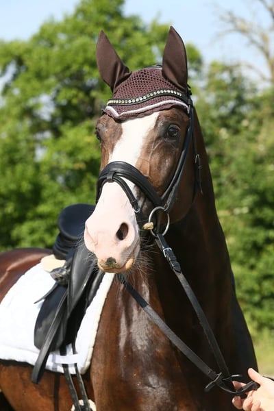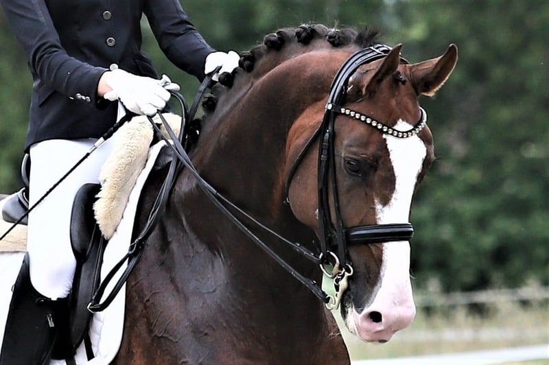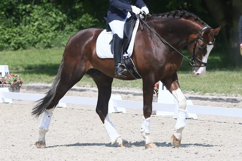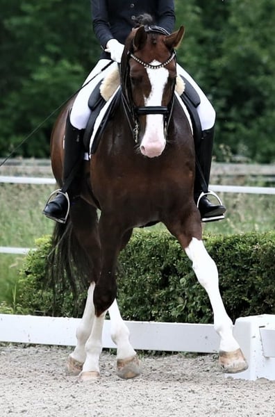 A dream stallion in chocolate chestnut with a lot of white. He was born in 2017, stands 1.74m tall, and has won several M* competitions and placed in M**. It is a pleasure to ride him. He has a lot of power from behind, and all three gaits are outstanding. Rhythm, impulsion, uphill ability, rideability, and an excellent character... he is very manageable as a stallion, even at competitions.