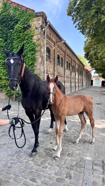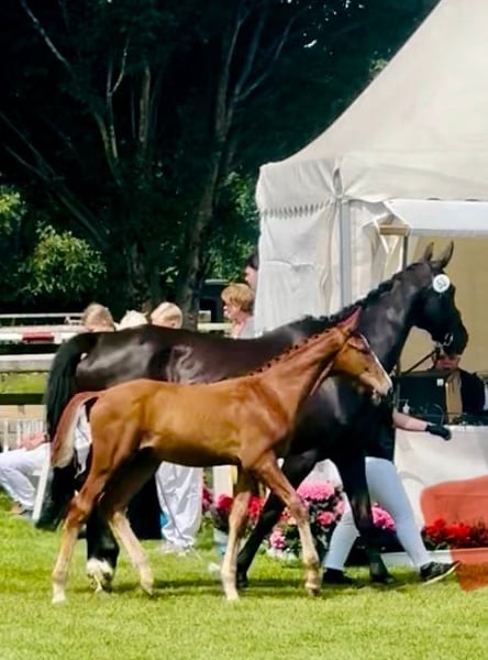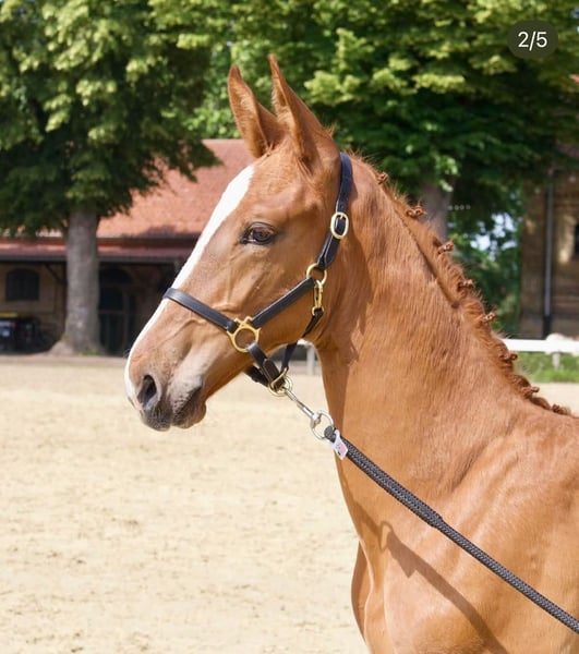 Preis:.9.000 € Rasse: Oldenburger Typ: Hengstfohlen Geburtsdatum: 04.04.2025 Lebensnummer: DE 433330058425 Farbe: Fuchs Zuchtverband: Oldenburger 🧬 Abstammung – ein Pedigree der Extraklasse • Vater: Extreme U.S. – Millennium-Sohn mit modernster Dressurvererbung, aktuell einer der gefragtesten Jungvererber Deutschlands. • Muttervater: San Amour I – Spitzenhengst mit international erfolgreichen Nachkommen, bekannt für Rittigkeit und Typ. • Mutter-Muttervater: Weltmeyer – eine Legende der Dressurpferdezucht, steht für Kraft, Präsenz und Vererbungsstärke. 🏆 Highlights „Extreme Amore“ ist nicht nur ein außergewöhnliches Fohlen im Exterieur und in der Bewegung, sondern qualifizierte sich auch zum Fohlen-Bundeschampionat in Lienen – eine Bühne, auf der nur die besten Nachwuchshoffnungen präsentiert werden. Damit gehört er bereits jetzt zur Spitze seines Jahrgangs. ✨ Beschreibung Ein Hengstfohlen, das mit Ausstrahlung, Elastizität und modernem Typ begeistert: • Trab: schwungvoll, federnd, mit aktiver Hinterhand und Schulterfreiheit • Galopp: bergauf, kraftvoll und ausbalanciert • Schritt: großzügig, taktsicher, von erlesenem Rhythmus • Charakter: freundlich, neugierig, menschenbezogen – ein echtes Verlassfohlen „Extreme Amore“ vereint hochwertige Genetik, beste Bewegungsqualität und außergewöhnliche Präsenz. Ob für eine Karriere im Dressursport oder als Hengstanwärter – er bringt alles mit 📍 Standort 32139 Spenge , Deutschland