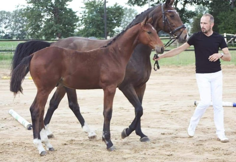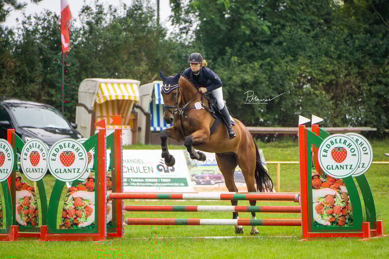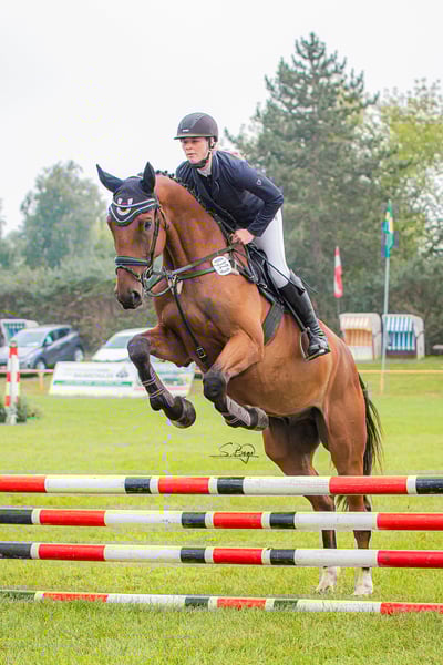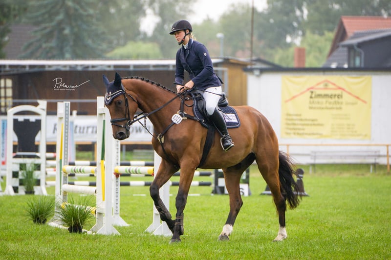 I am offering our gelding Spezi for sale. Spezi is a large-framed gelding who thinks he fits into every pocket. He is very people-oriented and super well-behaved. He has successfully completed his first tournament appearance and is ready to be presented further in the show jumping area. Spezi's mother, Aralmea ESC, has already produced several internationally successful S-level horses, licensed stallions, elite foals, etc. Extremely affectionate and people-oriented, he is a great buddy type who, due to his size, needs some time. Those who give him this time will find a friend and sports partner for life in Spezi. He impresses with his powerful gallop, his energetic trot, and his ability to jump. He has grown up in a mixed herd with us 24/7, is sociable, and is familiar with agricultural machinery, cattle, goats, etc. An absolute gem, but unfortunately a bit too big for us (very small riders), so we are looking for a suitable home for him. He is very easy-going and uncomplicated when being prepared, and he was absolutely calm during his first tournament appearance. Due to his young age, he is not yet a pure beginner's horse, but with professional support to ensure proper further training, he can certainly also be suitable for less experienced riders. 2020, gelding, 1.79m, registered OS Stakkatol x Ahorn Z x Ramiro - TÜV iO - Location MV No installment payments, etc. He is currently in professional training for further education. Price adjustment with increasing training.