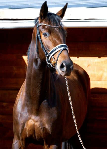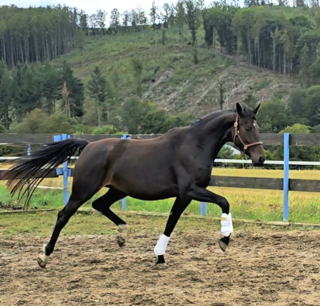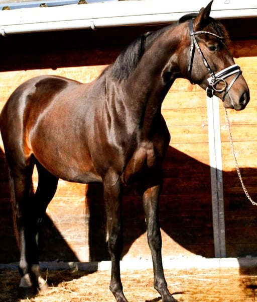 Very stylish, bloodlines-influenced mare by Global Player x Sandro Hit with very good, elastic gaits. Born 2021 A very modern blood horse with enough go. Raised in a herd environment. Untouched. Several of her siblings have already been sold abroad and have been successful up to class S. Directly from the breeder. X-ray images available. Please contact only via phone or WhatsApp.