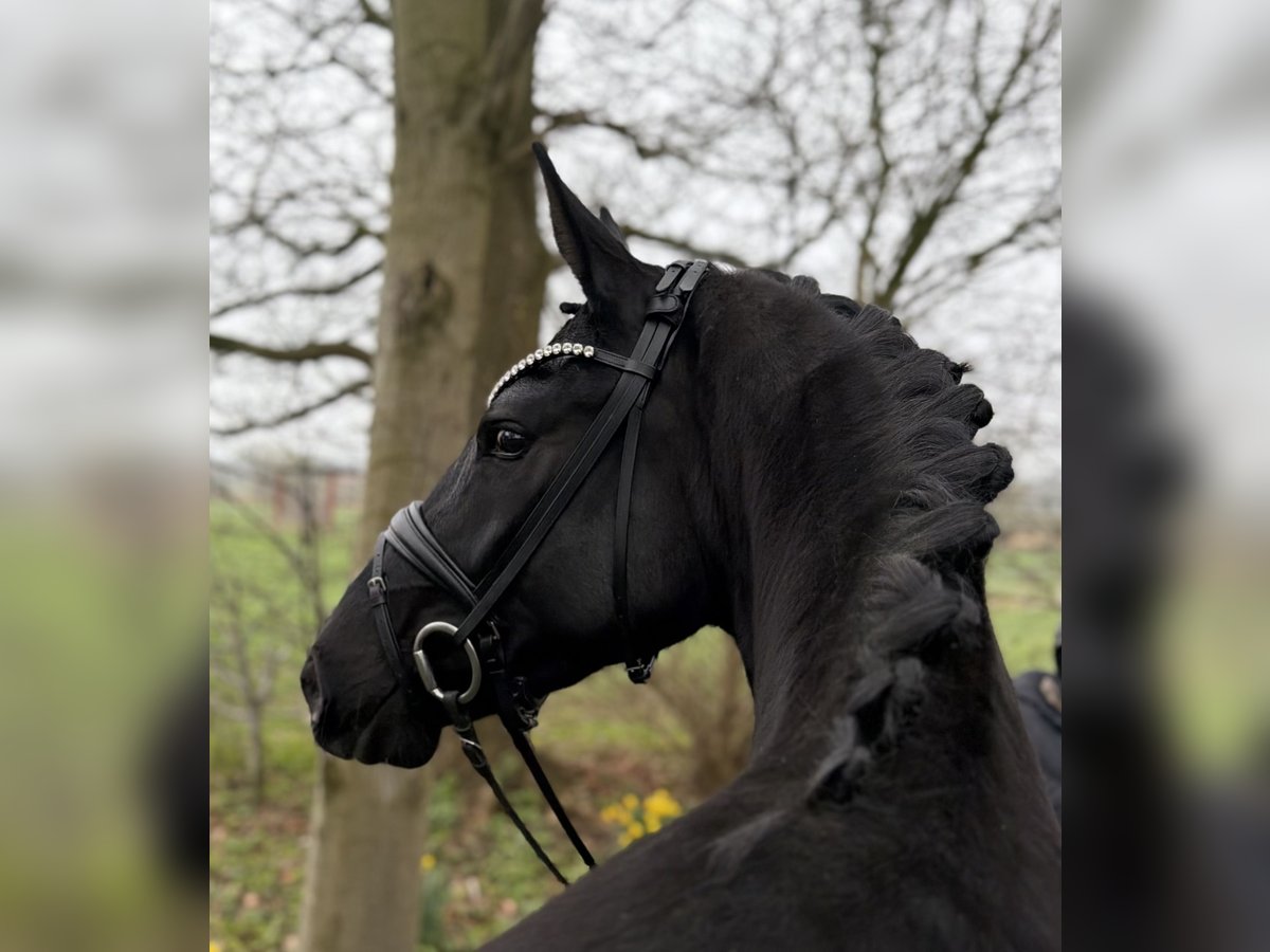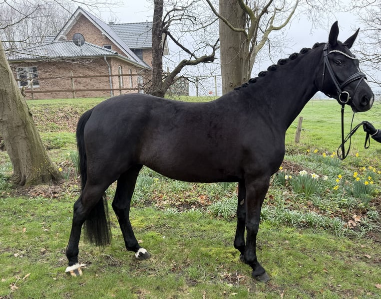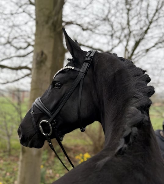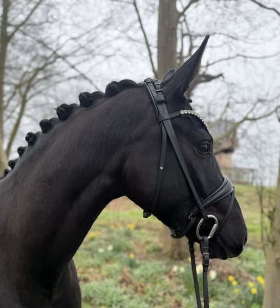Direkt vom Züchter steht eine vierjährige Rappstute aus bekanntem Mutterstamm zum Verkauf. Santana wurde erst in diesem Jahr angeritten und meistert die ihr gestellten Aufgaben stets gelassen und mit einer hohen Rittigkeit. Sie ist angenehm im Maul und besitzt drei schöne GGA. Charakterlich ist die Stute ebenfalls einwandfrei, hat keinerlei schlechte Angewohnheiten oder Charaktereigenschaften und ist ein ganz ausgeglichenes und verträgliches Pferd. Mit ihrer Größe von 1,67 m und ihrer kräftigen Statur deckt sie nahezu jeden Reiter gut ab und ist auch von zierlichen Frauen oder Umsteigern zu händeln. Santana ist auch als Zuchtstute sehr interessant. Sie ist die Schwester mütterlicherseits vom aktuellen Team-Europameister Denoix PCH unter Katharina Hemmer sowie vom S-erfolgreichen Dimacci K unter Antonia Kramer. Aus der engsten Verwandtschaft sind außerdem die unter Sandra Kötter erfolgreichen Oldenburger Vizechampions Siegfried K OLD und Bellingham K OLD , der außerdem auch Bundeschampionatsfinalist 2025 war. Weiterhin aus dem engsten Mutterstamm die S-erfolgreichen Sir Friedrich K, Desert Rose, u.v.m.