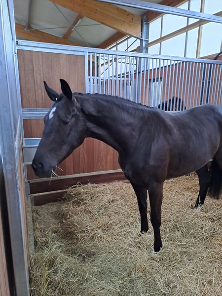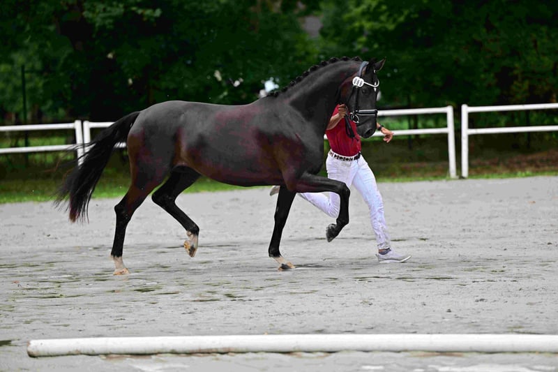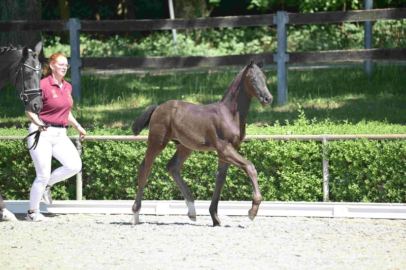 Jument typée avec de très bons mouvements. Elle a déjà eu deux poulains avec un très bon type et de bons mouvements. Actuellement, elle est pleine de Desperado. Elle possède un excellent caractère et est facile à manipuler. Elle a terminé son évaluation de performance avec un score de 8,30. Sur les trois dernières photos, on peut voir son poulain actuel, un poulain mâle de Glamourdale. Pour plus d'informations : Florian Runge 0174/33 21 987
