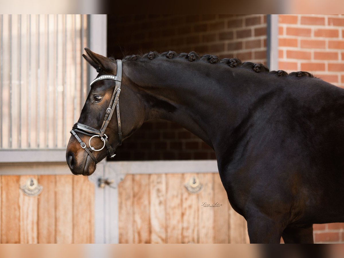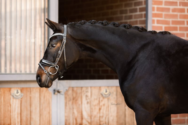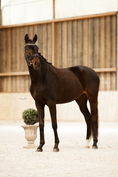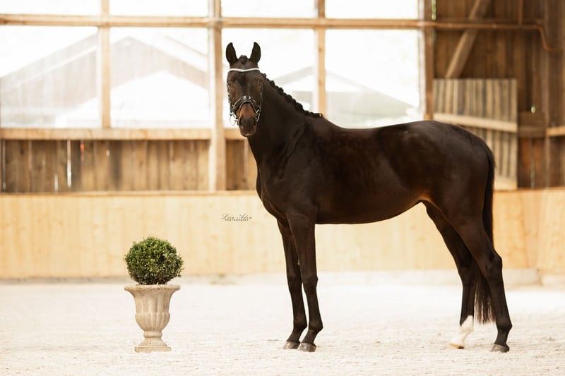 For sale is a stunningly beautiful 6-year-old black mare by Fürst Wilhelm × Benaggio. She stands at 1.66 m. She has been with us since she was a foal. She was raised in a herd environment and was also started under saddle with us. She is very refined and easy to ride, with a lovely willingness to move. As she is very refined, we are looking for a rider with a balanced seat and a soft, independent hand. She is very clear-headed, always well-behaved, and unflappable, even in open terrain. She lives in an open stable with us but is also familiar with a box stall. She is very socially compatible. Ideally, her new home would offer her an open stable, a paddock box, or a box with plenty of turnout and social contact. As she is a true treasure, we wish for owners who will consider her a family member. She has quite large splints on both front legs, which have never caused her any issues. A good X-ray vet check, including the back, from November '21 is available with no findings. She has been regularly dewormed, seen by the farrier, and checked by the physiotherapist. To ensure the well-being of our horse, a trial riding fee of 35 euros is charged, which will be refunded upon purchase. Please only phone inquiries at 0152 34387627.