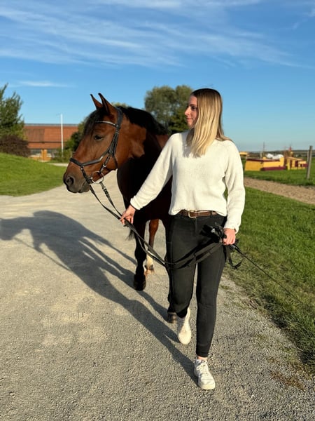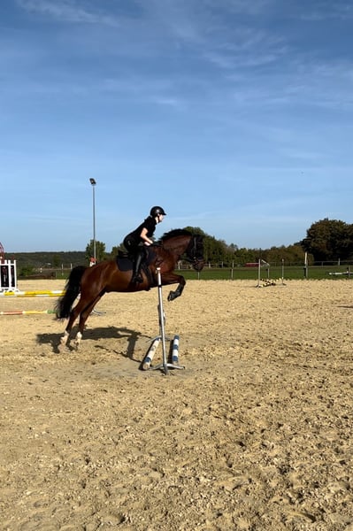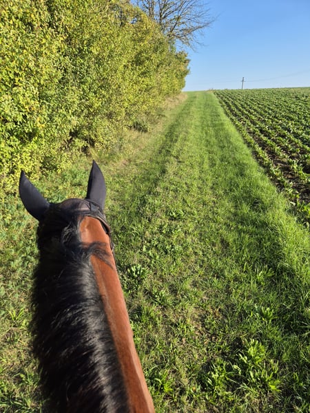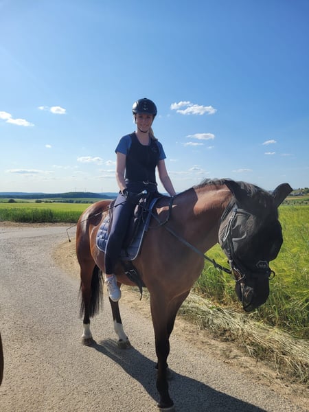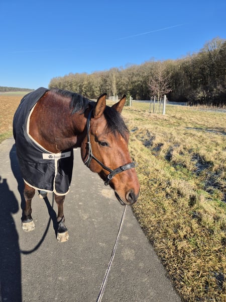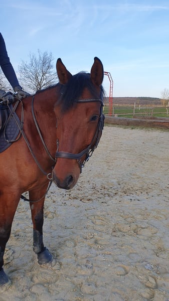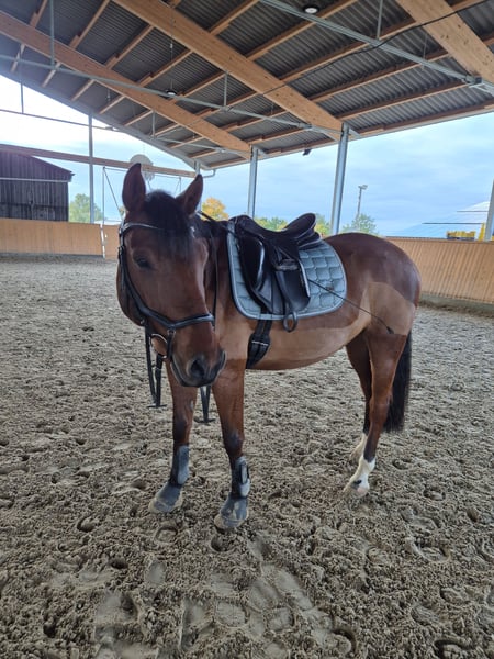 I am selling my 10-year-old gelding Rocketman. He measures approximately 1.55 meters at the withers, has a sturdy build, making him suitable for larger riders as well. Rocky is a very affectionate and cuddly horse. He is kept in a box with daily turnout to paddock or pasture, which I consider very important for his future home. He is very social with other horses and enjoys playing. In handling (grooming, tacking up, bridling), he is completely uncomplicated. Since I have no ambitions for competition, he has only been ridden recreationally over the past four years. His previous owners introduced him to rider competitions. He is trained up to A-level dressage and still has potential for further development with additional training. I have also participated in clinics for pole work. My riding partner has jumped him, which he thoroughly enjoys. He makes good jumps but needs a rider who can give him confidence and help him with proper distances. He is used to hacking alone and in groups. He adapts well to different riders but is not suitable for a riding school or dealer sale!! He is suitable for experienced adults and teenagers, but not a beginner’s horse. Rocky has been regularly dewormed and vaccinated. His teeth are checked every six months (no treatment needed), and he has received regular osteopathic/physiotherapeutic treatments. The saddles have also been regularly checked and adjusted. He is shod in front. During the summer, he is sensitive to flies around the head when riding, so I usually ride him outside with a nose net and fly mask. He is absolutely trailer-safe and stands calmly on the trailer. Price includes complete equipment, including a dressage saddle from Stübben and a jumping saddle from Passier.