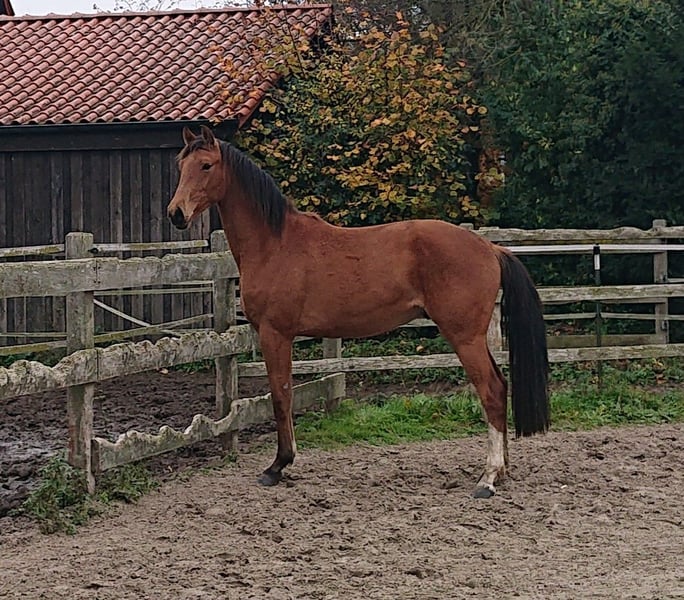 Although still in development, this very attractive, blood-type gelding possesses a lot of lift with a correct foundation. His energetic and powerful movements are uphill and characterized by a lot of rhythm. Several offspring from the dam line have been successful in sports, both in dressage and show jumping up to the advanced level. If desired, the horse can remain with us for further upbringing and training after purchase, should you appreciate our philosophy, in exchange for a contribution towards feed and work.