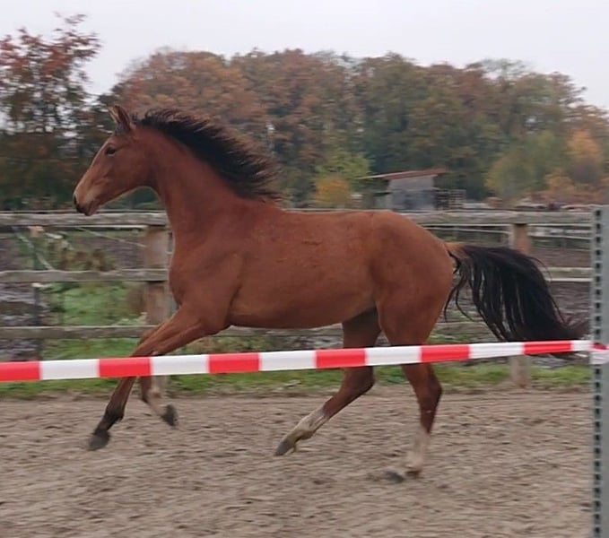 Aunque aún está en desarrollo, este muy elegante y bien proporcionado caballo castrado tiene mucho potencial con una base correcta. Sus movimientos son enérgicos y potentes, con una tendencia ascendente y se caracterizan por su gran ritmo. Del linaje materno han surgido varios descendientes que han tenido éxito en el deporte, tanto en doma como en salto, llegando hasta la categoría superior. Si lo desea, el caballo puede permanecer con nosotros tras la compra, para su posterior crianza y entrenamiento, a cambio de una compensación por la alimentación y el trabajo, si le gusta nuestra filosofía.