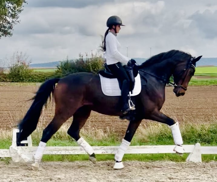 Encanto ist ein typvoller 6-jähriger Oldenburger Wallach mit herausragender Abstammung und drei kraftvollen, elastischen Grund-gangarten, die Ausdruck, Leichtigkeit und Schwung perfekt verbinden. Er ist bis jetzt auf Dressurpferde-L ausgebildet und zeigt bereits deutliches Potenzial für die höheren Klassen - ein echtes Nachwuchstalent für ambitionierte Dressurreiter. Unter dem Sattel ist Encanto voller Energie, aber brav, lernwillig und äußerst motiviert, dabei gleichzeitig sehr feinfühlig. Er sucht einen erfahrenen Reiter, der sein Talent weiter fördert und ihm die Möglichkeit gibt, sich sportlich zu entfalten. Im täglichen Umgang zeigt er sich sehr gelassen, zuverlässig und unkompliziert, ein Pferd, das man einfach gern hat. Er steht Tagsüber in einer kleinen Herde draußen auf der Koppel und liebt das spielen mit anderen Pferden. Auch im Gelände zeigt er sich ganz entspannt. Vor ca. 1,5 Jahren hatte Encanto eine kleine Sehnenverletzung die vollkommen ausgeheilt ist. Er ist voll im Training und sein Ausbildungsstand wächst stetig. Encanto vereint Charakter, Qualität und Perspektive - ein Dressurpferd, das seinen Reiter langfristig begeistern wird. Wir verkaufen ihn, da wir für unsere Tochter ein weiteres Pony für ihre nächsten 3 Ponyjahre suchen. Bei Fragen zu Encanto können sie sich gerne telefonisch melden.