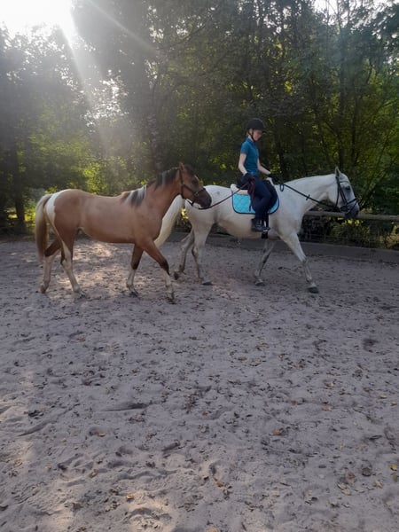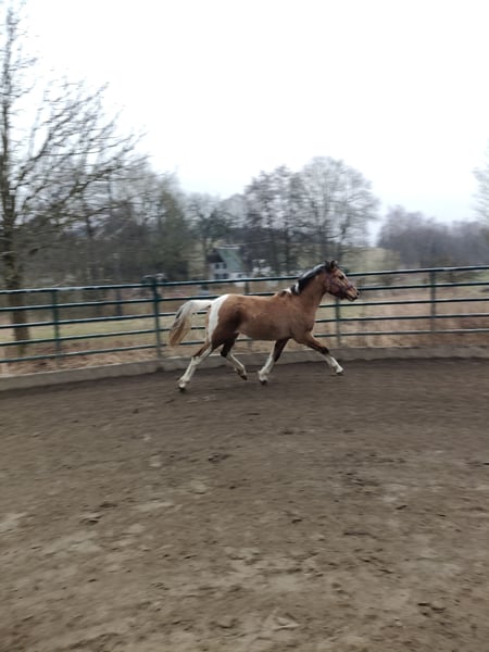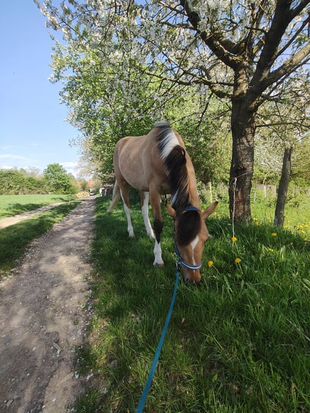 Diese wunderschöne und extrem gelehrige Falbscheckstute sucht ihr perfektes Zuhause. Sie ist korrekt gebaut, robust aufgezogen, sehr gut bemuskelt, alle 8 Wochen bei der Hufpflege, kennt Longieren, Spazieren gehen, Arbeit am Kappzaum, fährt brav Hänger und kennt erste Lektionen vom Boden wie hinlegen, Konterschulterherein und Schenkelweichen. An den Sattel haben wir sie bereits gewöhnt. In der Herde zeigt sie sich unkompliziert. Ihre Farbe macht sie zu einem ganz besonderen Hingucker. Gezogen wurde sie im Gestüt Zollmann, ihr Vater ist der homozygote Grullo-Paint- Hengst "Pepsi" und die Mama ein Reitpony. Ab März ist sie bereit, schonend angeritten zu werden. Dies kann auf Wunsch noch bei uns am Hof erfolgen. Mehr Videos und Fotos gerne auf Anfrage.