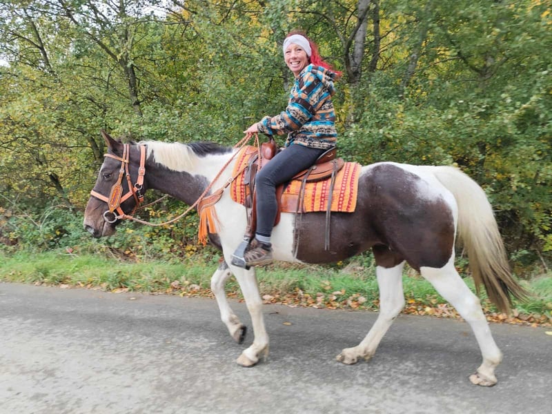 Freizeitpartner-Wanderreiten -Schul oder Familienpferd CALINE Alter: 7 Jahre Stockmaß: ca. 1,58 stm Preis: 6900 AKU: vorhanden E-Paß u. Microchip ✨ Über die Stute: Diese nette Pinto Stute hat ein freundliches Wesen. Sie ist brav im Umgang,unter dem Sattel brav und zeigt sich stets menschenbezogen und lernwillig. Mit ihrer charmanten Art ist sie eine tolle Freizeitpartnerin . Ihr Westernsattel und Zubehör kann für 1500,- mit ins neue Heim gebracht werden . Perfekt für: Pintostute die sowohl im Gelände als auch in der Freizeit überzeugt Kennt Herdenhaltung im Offenstall sowie auch Boxenhaltung . Unsere Pferde: – regelmäßig entwurmt – vom Schmied & Osteopathen betreut Hofladen: Westernsättel, Trensen, Zubehör ihr Westernzubehör kann gerne übernommen werden ca. 1500,. incl Markenwesternsattel . Transport & Zubehör auf Wunsch günstig organisiert Unser Service: ✅ 3 Monate Umtauschrecht ✅ Proberitt: 35 €, jedes weitere Pferd 25 € (beim Kauf am selben Tag angerechnet) ✅ 100 € Sofort-Rabatt bei Abholung/Transport am selben Tag ✅ Persönliche & ehrliche Beratung Anfragen bitte nur telefonisch: 0171 – 4001968 Täglich erreichbar von 8–20 Uhr ⚠️ Keine E-Mail oder WhatsApp ⚠️ Alle Angaben ohne Gewähr