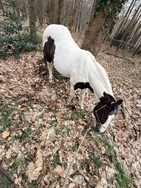 „BumbleBee“ is a 13-year-old handsome Pinto / Paint Pinto with a piebald coat, purchased by us at the end of 2024 as a backed beginner horse for further training. However, under saddle, he now shows resistance to leg pressure, becomes uncooperative, and withdraws from any cooperation. This is followed by biting attempts and, in some cases, bucking. It is likely that BumbleBee has unfortunately had very negative experiences in his past, which were not disclosed to us at the time of purchase. According to professional assessment, this behavior can only be managed long-term by an experienced trainer. Therefore, BumbleBee is explicitly offered as not suitable for riding. BumbleBee has been ground-trained and desensitized by us following pro-ride horsemanship principles by Thomas Günter. He is familiar with work on the longe line as well as free work. He is curious and fearless. Accordingly, he also enjoys relaxed rides in the countryside. In principle, BumbleBee is a very personable, kind, and friendly leisure partner with a big heart who enjoys groundwork. He is very uncomplicated in his dealings. He is a reliable companion in the field; on the ground. BumbleBee is a lower-ranking horse and friendly and curious towards his herd mates. Currently, he is housed in a box with an outdoor paddock, but he is also familiar with a pasture with a herd. BumbleBee stands approximately 1.58 meters tall. He has a Spanish equine passport, has been regularly vaccinated (influenza, herpes, tetanus), dewormed, and is presented to the hoof orthopedist every 4 weeks as a barefoot horse; he is absolutely shod-free. An annual dental check-up (most recently in November 2025) has also been carried out. He always receives the veterinarian calmly. During pollen season, he temporarily experiences respiratory issues with coughing and is fed soaked hay. Currently, he is free of any complaints. We are looking for a new, loving home for BumbleBee where there is joy in groundwork, or where he can serve as a companion horse or be out and about on foot with his person.