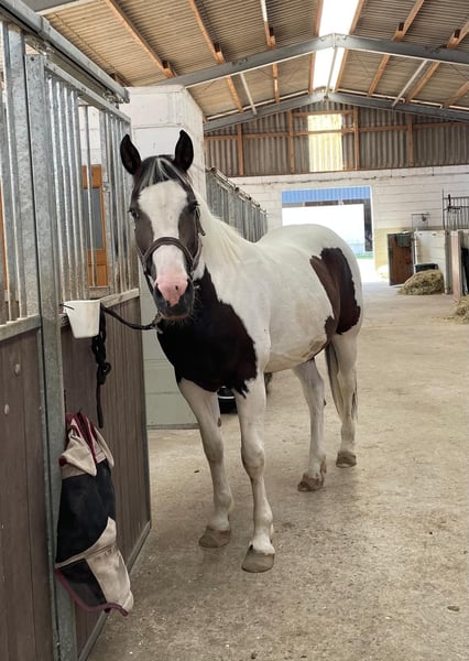 „BumbleBee“ ist ein 13-jähriger, hübscher Pinto / Paint Schecke, der von uns Ende 2024 als angerittenes Anfängerpferd für die weitere Ausbildung gekauft wurde. Unterm Sattel zeigt er sich aber nun bei Schenkeldruck nicht kooperativ, verschließt sich und stellt jede Zusammenarbeit ein. Es folgen dann auch Beißversuche und ggf. Buckeln. Vermutlich hat BumbleBee in seiner Vergangenheit leider sehr schlechte Erfahrungen machen müssen, die uns beim Ankauf verschwiegen wurden. Nach fachlicher Einschätzung wird dieses Verhalten bei BumbleBee nur durch einen Profi auf Dauer händelbar sein. Daher wird BumbleBee ausdrücklich als nicht reitbar angeboten. BumbleBee wurde von uns nach pro-ride Horsemanship nach Thomas Günter auf dem Boden ausgebildet und desensibilisiert. Arbeit mit der Longe sowie die Freiarbeit kennt er. Er ist neugierig und unerschrocken. Entsprechend entspannt ist er auch gerne im Gelände unterwegs. Grundsätzlich ist BumbleBee ein sehr menschenbezogener, netter und freundlicher Freizeitpartner mit einem großen Herz, der gerne auf dem Boden arbeitet. Dabei ist er total unkompliziert. Er ist ein verlässlicher Begleiter im Gelände; am Boden. BumbleBee ist rangniedrig und gegenüber seinen Artgenossen freundlich und neugierig. Aktuell steht BumbleBee in einer Box mit Außenpaddock. Er kennt aber auch den Offenstall. Das Stockmaß von BumbleBee ist etwa 1,58 m. Er besitzt einen spanischen Equidenpass, wurde regelmäßig geimpft (Influenza, Herpes, Tetanus), entwurmt und wird als Barhufer alle 4 Wochen dem Huforthopäden vorgestellt; dort ist er absolut schmiedefromm. Eine jährliche Zahnkontrolle (zuletzt 11/2025) erfolgte ebenfalls. Den Tierarzt empfängt er stets entspannt. Unterjährig hat er temporär (Pollensaison) Atemwegsprobleme mit Husten und bekommt bei uns daher gewässertes Heu. Aktuell ist er beschwerdefrei. Wir wünschen uns für BumbleBee ein neues Sterne-Zuhause, wo man Spaß an der Bodenarbeit hat, oder aber wo er als Handpferd, oder zu Fuß mit seinem Menschen draußen unterwegs sein kann.