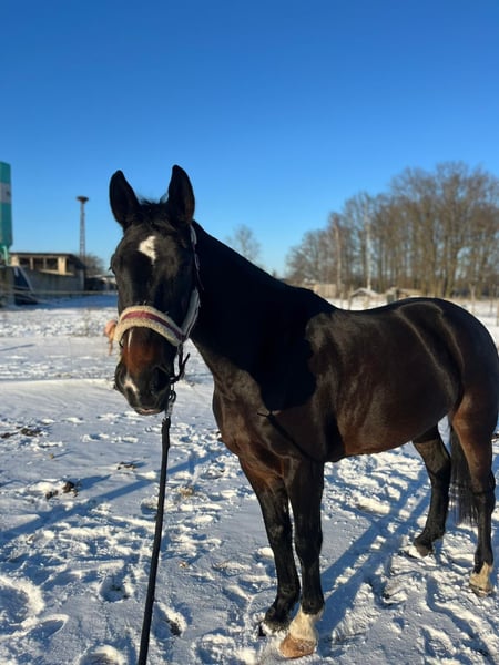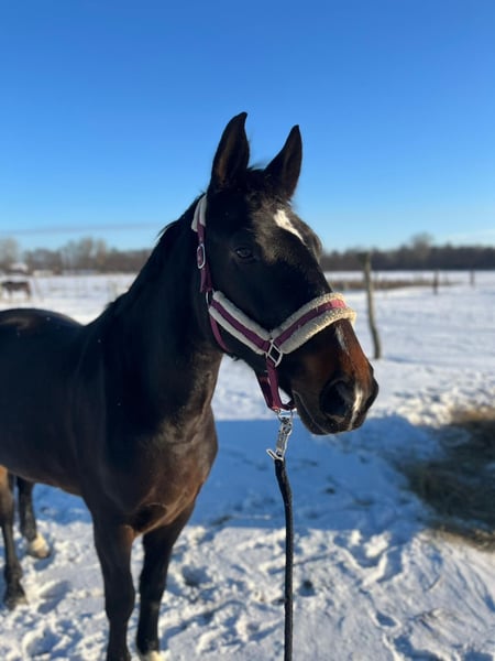 Peppa ist eine siebenjährige Halbblut Stute mit viel Ausstrahlung und dem Herz am rechten Fleck. Sie ist ca. 1,65 m groß und für jeden Spaß zu haben. Dressurarbeit auf dem Platz, kleine Sprünge oder Geländegänge, Peppa ist immer arbeitswillig , motiviert und mit voller Eifer bei der Sache. Sie möchte immer gefallen, ist neugierig und liebt Beschäftigung – am liebsten jeden Tag. Auf Grund ihrer manchmal übermotivierten Arbeitseinstellung ist sie nichts für absolute Reitanfänger. Bei ausreichend Auslastung hingegen , wäre sie eventuell sogar als Schulpferd denkbar. Im Umgang ist sie unkompliziert, schmiedefromm und lässt sich auch von Kindern problemlos führen und putzen. Wir würden Peppa gern in ambitionierte Freizeithände geben. Jemand der Zeit und Lust hat sich wirklich mit ihr zu beschäftigen und mit ihr zu einem Team zusammen zu wachsen.