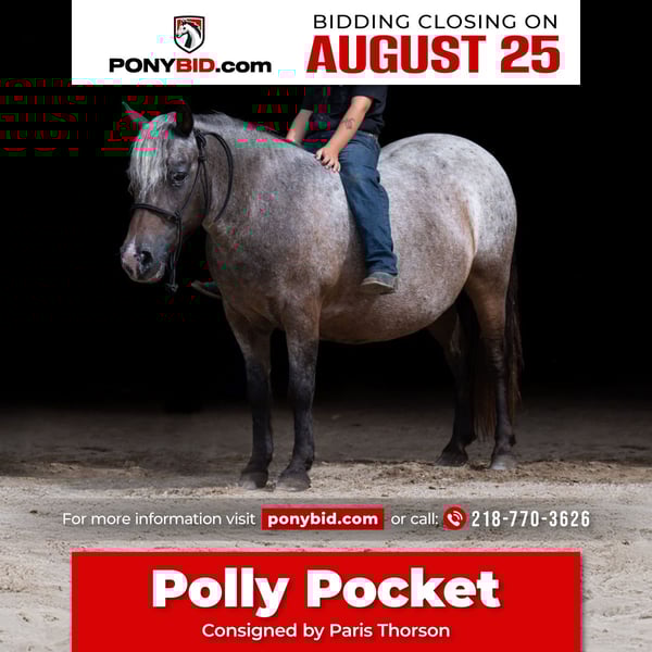 ✨ 𝐀𝐔𝐆𝐔𝐒𝐓 𝓐𝓵𝓵 𝓢𝓽𝓪𝓻 𝑷𝑶𝑵𝒀 𝓛𝓲𝓷𝓮𝓾𝓹 ✨ Happening now thru MONDAY | AUGUST 25th - Available EXCLUSIVELY on PonyBid's website! For more details and to register visit: www.Ponybid.com CONSIGNOR CONTACT: Paris Thorson 218-770-3626 LOCATION: Nevis MN BREED: POA REGISTERED: No COLOR: Bay Roan POA HEIGHT: 45 Inches AGE: 11 GENDER: Mare Are you searching for a pony that's not only adorable but also a reliable and versatile member of your family? Look no further than Polly Pocket! Polly has been cherished in our family since she was very young, known for her exceptional temperament and proven ability to produce foals with outstanding personalities and intelligence. She is a POA pony, combining beauty with brains! The pony everyone should have in their pastures! Polly’s consistency is one of her best traits. Whether she's been resting for a year or actively ridden, she remains the same dependable pony. This makes her incredibly low-maintenance and ready to ride whenever you are. Polly is an excellent step-up pony for your child, ready to take on any adventure. Whether your kiddo dreams of leisurely trail rides, wanting to help move cows from pasture or push the roping steers up the alley, participating in exciting play day events, Polly is well-equipped to handle it all. Her versatility ensures she can adapt to whatever equestrian path your child chooses. She has experience in various disciplines, including gathering cows from the pasture and participating in play day events at our local horse shows. Polly has also enjoyed countless hours on the trails, proving her stamina and adaptability. She is well-versed in different environments and tasks, making her a truly all-around pony. Polly’s conformation is perfect for long days in the saddle. Her sturdy build and comfortable gait ensure both pony and rider can enjoy extended rides. She is the ideal size for young riders, providing an enjoyable riding experience. Don’t miss the opportunity to welcome Polly Pocket into your family. We have thoroughly enjoyed Polly and she has been such a fun member of our family! She is more than just a pony; she is a reliable partner, a gentle friend, and a versatile pony ready to bring joy and success to her next rider.