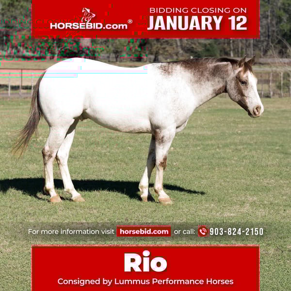 ♦️𝐍𝐄𝐖 𝐘𝐄𝐀𝐑'𝐒 𝑬𝒙𝒕𝒓𝒂𝒗𝒂𝒈𝒂𝒏𝒛𝒂♦️ Happening now thru MONDAY | JANUARY 12th - Available EXCLUSIVELY on HorseBid's website! For more details and to register visit: www.Horsebid.com CONSIGNOR CONTACT: Lummus Performance Horses 903-824-2150 LOCATION: Bloomburg, TX BREED: POA REGISTERED: Yes REGISTERED NAME: CHR Mae Dayz Bud COLOR: Appaloosa HEIGHT: 13.2 AGE: 6 GENDER: Gelding Rio is an exceptional 6-year-old registered POA gelding standing 13.2 hands tall. He is truly the kind you don’t see offered for sale, he’s a part of our family and one of the favorites in the barn. Rio is always the first to meet you at the gate and has that easy-going disposition. He has all the outside experience and has been trail ridden down the road, through the thickets, hog hunted on, hauled to town, and exposed to ropings, barrel races, and rodeos. Outside on the trail he takes great care of his rider, he will go down steep creek banks slow and easy and cross the creek with ZERO jumping. He will walk right thru it with no hesitation. Did I mention Rio does TRICKS?? He will lay down and sit up on command!! ❤️ We have been roping the sled dummy on him and have started him on the barrels and poles. Rio is very athletic, turns around correctly, wants to stop hard, and will step off into a slow, smooth lope from a standstill. This gelding is extremely easy to ride with smooth gaits and genuinely wants to please. He side passes, opens and closes gates, picks up correct leads, counter-arcs, and lopes easy, collected circles. My 7 and 10 year old can catch, brush, saddle, and ride him completely on their own. Rio is 110% safe with absolutely no buck, bite, or kick. He can be left off for months, caught, and stepped right into a lope he’s just that honest and uncomplicated. He is gentle, leads, loads, bathes, stands tied quietly, great to groom, saddle, bridle, hauls well, and gets along great with others (currently turned out in a mixed herd of eight). He rides the same in the arena as he does outside and is an AMAZING trail horse. He is not buddy or barn sour and will confidently ride off alone wherever you ask him to go. Rio is just the right size to carry a kid or an adult. My husband is 5’11 and rides him everywhere also! He is UTD on farrier, dewormer, and vaccinations.