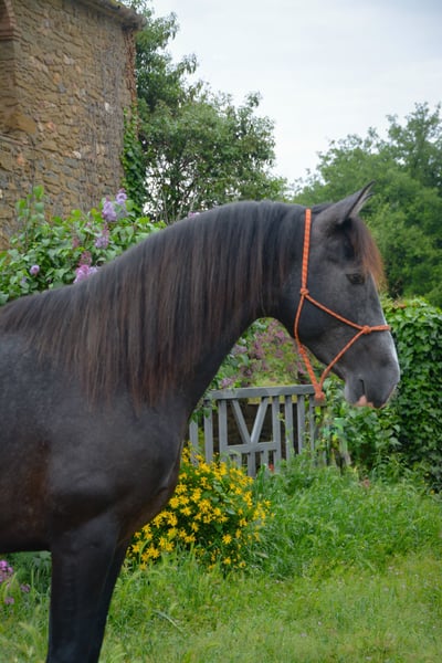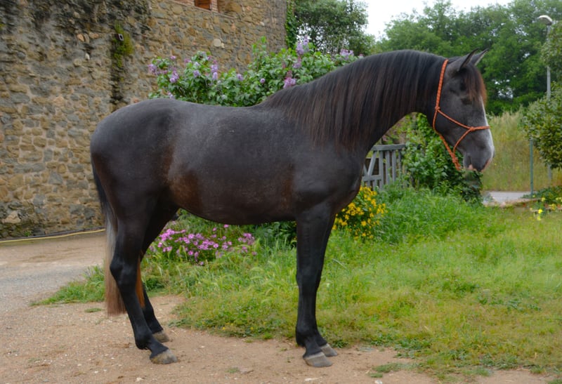 CORRIOL II, poulain PRE entier gris de 3 ans, 162 cm de hauteur, récemment sorti du champ avec de bons mouvements et une bonne morphologie, débutant son débourrage et commençant à être monté.
