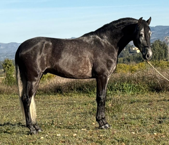 Batalay Momo is a gorgeous dressage prospect with a particularly friendly character. This lovable stallion is a real eye-catcher and impresses not only with his looks but also with his wonderful charisma. His size also makes him ideal for taller/heavier riders. Batalay has enjoyed a classical training and is currently performing at a good A level, mastering lateral movements and half-passes. He gives his rider a great riding experience and is simply fun to ride. In addition, he has three excellent basic gaits for classical dressage. Batalay is, of course, a true gentleman in his manner and shows no stallion behaviour even in a large, mixed stable with almost 180 horses. Of course, he can still be castrated before transport if desired. Batalay comes with full ANCCE papers and the best pedigree. Location: Spain – transport can be arranged worldwide.