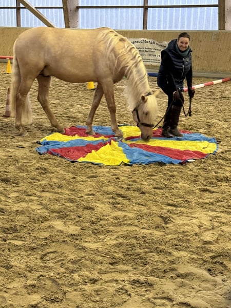 This extraordinary Palomino stallion has been with us since he was 2 years old and has been started under saddle and trained according to his age. He is currently at a safe A-level, and we have now begun working on lateral movements and canter on the outside. Dulzon is always motivated to work and is an absolute sunshine. Dulzon is a safe and balanced horse. He is uncomplicated to handle, trailers well, is good with the farrier, enjoys rides in pairs, and is familiar with the lungeing and water treadmill - he knows all these things. Dulzon has no stallion behaviors. For inquiries, please contact only via WhatsApp at 0171-3776471. Videos are always created on request, as his training level is constantly evolving.