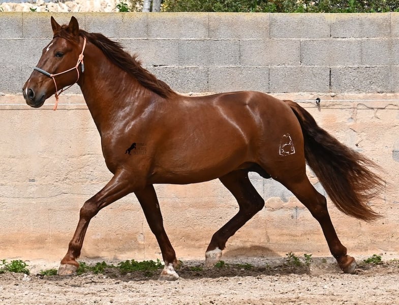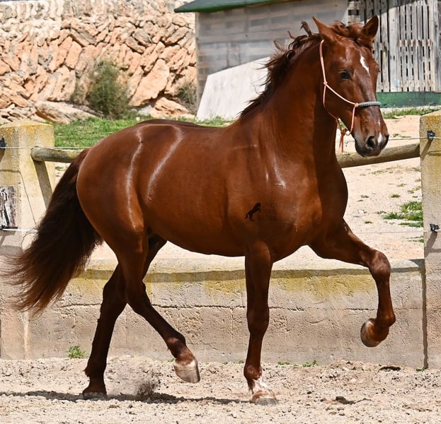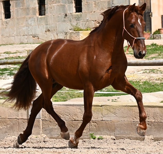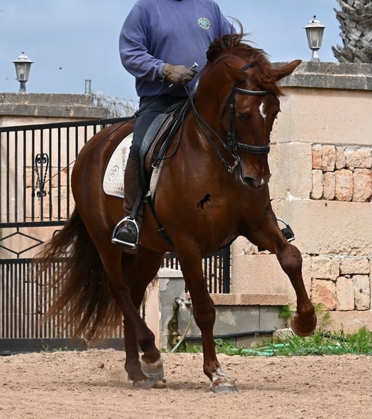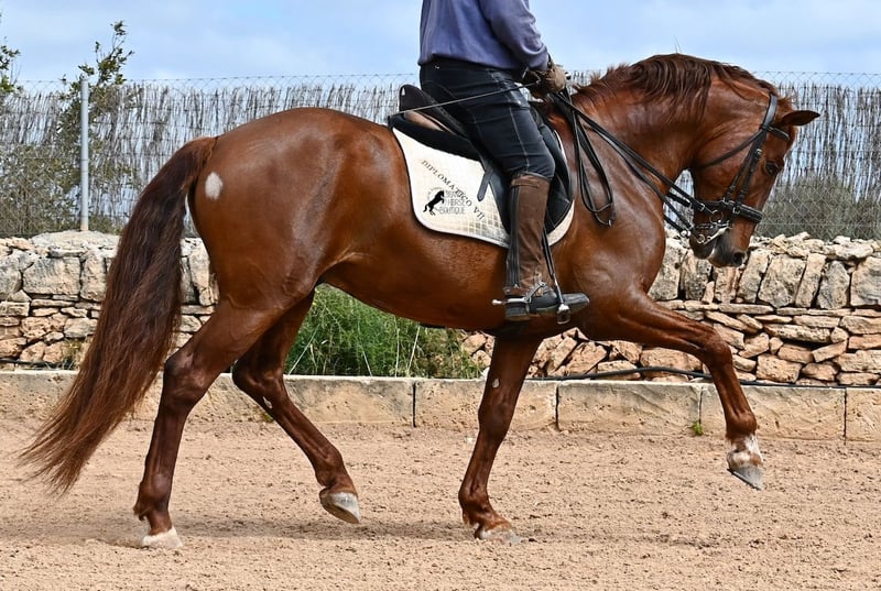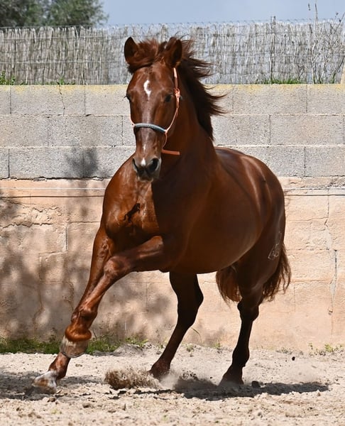Dieser 2020 geborene PRE Hengst (Andalusier mit Rassenachweis der ANCCE), ist in vielen Aspekten, eine wahre Augenweide! Unumstritten fällt einem als Erstes seine atemberaubende Schöhnheit auf, die der Kupferstich in seinem Fell und der Esprit, nur so verstärken. Doch hinter der schönen Fassade, gibt es einiges mehr zu entdecken. Seine Abstammung ist superior, denn er ist ein Sohn des mehrfachen WELTCHAMPION Fer Bonachon de Eda und somit ein Enkel des berühmten Fer Bago. In seiner Abstammung finden wir nicht nur den Weltchampion und somit die FERRERO Linie, sondern auch Monis, Marin Garcia, Yeguada Militar, Guardiola und Bohorquez! Mütterlicherseits hat er Rappen, Füchse und Braune in der Abstammung, was ihn auch als Zuchthengst sehr interessant macht, da die meisten Bonachon-Kinder dem Vater als Schimmel gleichen und er diese TOP Linie vererbt, mit mehr Option auf farbige Nachzucht. Er ist gekört und hat bereits eine Nachzucht- ebenso ein Fuchs, was bestätigt, dass er farblich als Zuchthengst, nebst der Abstammung, mehr als interessant ist. Im Handling ist er ein absoluter Gentleman und obwohl er schon gedeckt hat, überhaupt nicht heiß oder hengstig. Sollte Hengsthaltung nicht möglich sein, bestände selbstverständlich die Option der Kastration vor Ort. Ambitionierte Reiter werden definitiv Spass an ihm haben, denn er lernt schnell und unter dem Reiter will er alles geben und taut so richtig auf. Auch unterm Sattel zeigt er absolut keine Unarten und ist unermüdlich. Wo andere PRE nach 15´sagen bitte fertig, taut er erst richtig auf und gibt alles. Seine Haltung ist auch ideal, was sich in seinem ausgeglichenen Wesen widerspiegelt. Er ist tagsüber frei auf dem Paddock, nachts zum Ruhen in der Box, wird 3x die Woche geritten und das meist im Gelände! Er ist im Gelände ein absolutes Verlasspferd und unerschrocken, egal ob alleine oder in Begleitung. Sei es Baumaschinen oder LKWs die an ihm vorbeirasen, er bleibt cool und marschiert weiter! Stundenlange Ausritte gefallen ihm auch gut, da kann er seine Ausdauer so richtig unter Beweis stellen. Am Platz ist er absolut fokussiert und beherrscht Seitengänge in allen Gangarten und hat schon genügend Gleichgewicht für große Runden im Außengalopp. An der Hand wird ihm gerade der spanische Schritt beigebracht. Ein wunderschöner, liebevoller und erzogener Hengst, mit viel Potenzial in diversen Sparten, der das Auge und das Herz erfreut! Preis der Qualität entsprechend. Sein aktuelles Stockmaß liegt bei 160cm. Aktuell steht er auf Mallorca! Videos und Abstammung gerne auf Anfrage. Gerne organisiere ich vor Ort eine AKU, Kastration, Beritt, Transport oder auch ihre Reise, sollten Sie persönlich zum Anschauen kommen. Details dazu gerne auf meiner Seite oder im Gespräch. Saludos aus Spanien