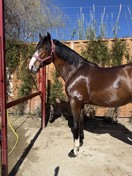 Caballo español Está entero, tiene muy buen carácter con otros caballos, ha salido varias veces de concurso sociales y un territorial, sale al campo y se ha metido en el río también. El manejo a la mano es muy bueno y para el transporte tambien