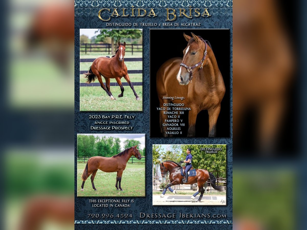 Calida Brisa is a stunning bay purebred 2024 PRE Andalusian filly with an exceptional pedigree! She was bred for dressage and descends from a full spectrum of Spanish champions and proven producers of dressage champions. Her amazing sire, Distinguido Trujillo hails from the #1 breeder in the USA, Sabas Trujillo, as does her maternal grandsire. Her future as a performance prospect is underscored by an impressive lineage of champions: Remache, Yaco de Torreluna, Yaco II, Ganador VII, Acquilles III, and Vasallo II. Calida is an athletic, light and refined filly, with correct and balanced conformation. She has a super calm and confident temperament - just like her dam. This filly will be tall, (sire is 17.2) and at the time of weaning, she was nearing 14 hh and is now 15H as a yearling. Located near the Buffalo, NY border in Ontario Canada. ANCCE inscribed.