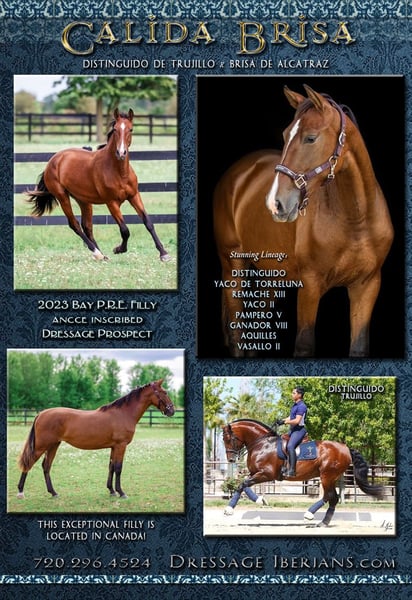 Calida Brisa est une superbe pouliche andalouse bai pur-sang de 2024 PRE avec un pedigree exceptionnel ! Elle a été élevée pour le dressage et descend d'un large éventail de champions espagnols et de producteurs éprouvés de champions de dressage. Son père, Distinguido Trujillo, est issu du meilleur éleveur des Etats-Unis, Sabas Trujillo, tout comme son grand-père maternel. Son avenir en tant qu'espoir de performance est souligné par une impressionnante lignée de champions : Remache, Yaco de Torreluna, Yaco II, Ganador VII, Acquilles III et Vasallo II. Calida est une pouliche athlétique, légère et raffinée, avec une conformation correcte et équilibrée. Elle a un tempérament très calme et confiant, tout comme sa mère. Cette pouliche sera grande (son père mesure 17,2) et approchera les 14 hh au moment du sevrage. Située près de la frontière de Buffalo, NY, en Ontario, Canada. Inscription avec ANCCE en cours.