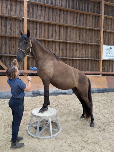 Mezaia de Santon est une pouliche à la robe atypique et au caractère doux. Ses parents sont indicés génétiquement à 94 % (père) et 98 % (mère). Son arbre généalogique est disponible en photo (voir ci-dessus). ✨ Mezaia est curieuse, elle apprend avec calme et en confiance. Elle franchit ainsi toutes nos embûches de Mountain Trail sereinement, et a construit des bases solides de travail au sol qui lui permettront un débourrage de la même qualité. Elle sera une jument d’une taille d’environ 1m55, réfléchie et proche de l’homme. Comme tous les chevaux rejoignant Alegria, Mezaia est éduquée selon le cursus de la Relation de Complicité®, notre méthode d’éducation qui vous garantit sécurité et sérénité. Possibilité de la réserver dès maintenant et de poursuivre son éducation et son débourrage avec notre accompagnement sur le Haras ou grâce à notre formation en ligne. -- ALEGRIA – Trouvez le cheval de vos rêves et créez une relation unique, fondée sur la confiance et la complicité . Chez Alegria, nous savons que l’achat d’un cheval est bien plus qu’une simple transaction. Il s’agit de trouver un partenaire de vie avec lequel vous allez construire une relation solide et épanouissante. Nous vous offrons un accompagnement expert à chaque étape, pour que vous puissiez faire un choix éclairé et démarrer cette aventure en toute sérénité. Pourquoi choisir Alegria ? Un accompagnement personnalisé pour vous guider dans votre choix. Nous vous aidons à trouver le cheval qui correspond à votre personnalité, vos attentes et vos compétences, pour que la relation qui se tisse avec lui soit fluide et naturelle. ✨ Notre équipe d’experts vous conseille, vous guide et vous accompagne dans votre démarche afin que vous fassiez un choix éclairé, sans précipitation. Des chevaux élevés dans un environnement propice à leur bien-être. Nos chevaux sont élevés dans des conditions exceptionnelles, où ils bénéficient d’une éducation douce et respectueuse ️, fondée sur notre méthode exclusive "Relation de Complicité". Chaque cheval est préparé pour être un partenaire fiable, réactif et équilibré, prêt à bâtir une relation de confiance avec vous. Des soins de qualité pour garantir une santé optimale. Le bien-être de nos chevaux est primordial. Ils sont suivis régulièrement par des experts de la santé animale : vétérinaires, ostéopathes, maréchaux-ferrants et dentistes. Ce suivi médical garantit que votre cheval sera en pleine forme, prêt à débuter cette nouvelle relation avec vous dans les meilleures conditions. Un suivi transparent grâce aux fiches de progression. Chaque cheval bénéficie d’une fiche de progression détaillée qui vous permet de connaître son niveau exact, ses points forts et son caractère. Cette transparence vous offre toutes les clés pour choisir le cheval qui correspondra à vos attentes et à la relation que vous souhaitez construire avec lui. Un accompagnement continu pour réussir cette relation. Chez Alegria, nous croyons qu’une relation durable ne s’improvise pas. C’est pourquoi nous restons à vos côtés après l’achat , avec un suivi personnalisé pour vous aider à construire une véritable complicité avec votre cheval. Grâce à nos formations en présentiel et en distanciel, vous apprendrez à mieux comprendre votre cheval et à renforcer les bases de votre relation. Des témoignages de clients satisfaits. Nous avons accompagné des centaines de cavaliers dans leur projet. 100% de nos clients sont satisfaits de l’accompagnement et de la relation qu’ils ont pu tisser avec leur cheval. Leur témoignage est la meilleure preuve de la qualité de notre travail et de la réussite des relations que nous favorisons. Trouvez le cheval qui correspond à vos attentes. Découvrez dès maintenant notre sélection de chevaux exceptionnels et commencez à imaginer la relation que vous allez créer avec lui. Consultez les fiches de progression et laissez-vous guider par notre équipe d’experts pour trouver le cheval qui répond à vos attentes. Découvrez notre sélection de chevaux sur www.alegriacomplicite.com et commencez à construire la relation dont vous rêvez. Alegria – Trouvez le cheval qui vous correspond et créez une relation fondée sur la confiance et la complicité .