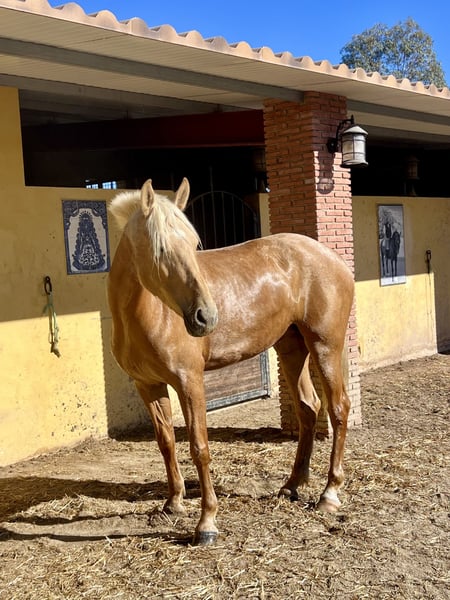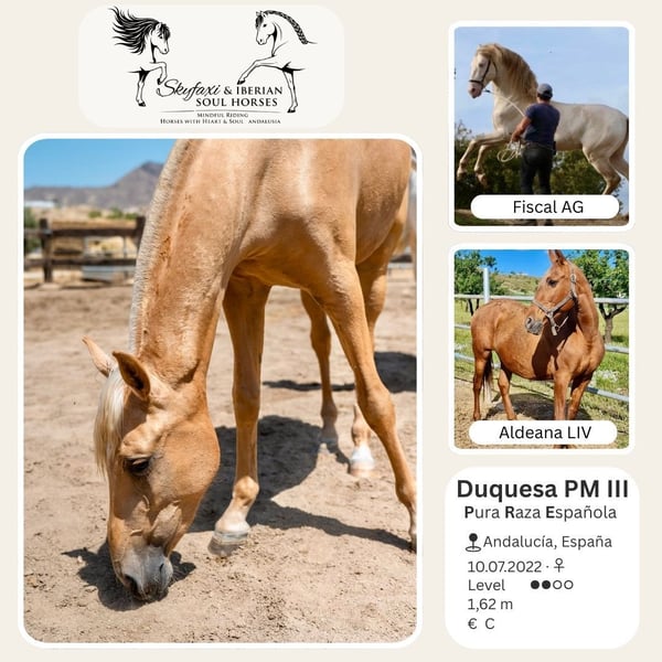 This raw diamond is now for sale. She will turn four years old in July and is gradually and gently being backed. She is very calm and cooperative in handling. We expect her future training to proceed smoothly and in a structured manner. She is attentive, eager to learn, and intelligent. A full sibling of hers is already performing very well under saddle. The mare lives in a herd environment, in accordance with her natural needs, and was not raised in isolation in a box. The two smaller photos show her sire and dam. Further information about her pedigree, as well as additional photos and videos, are available upon request. 📍 Location: Andalusia, Spain SKYFAXI & Iberian Soul Horses https://www.fincadelahorca.es