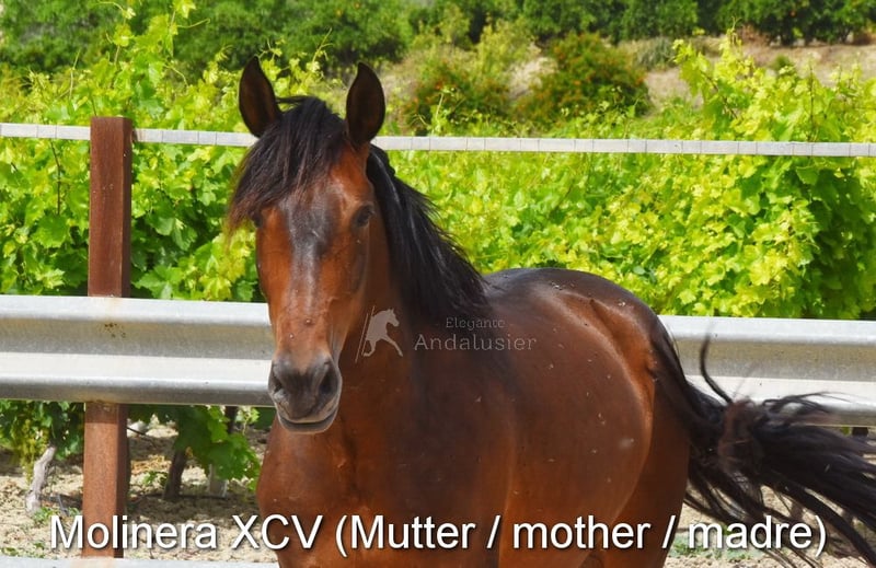 cher caractère avec tempérament, brut, est dehors avec d'autres juments, bonnes allures, ascendance : Escalera, Yeguada de Ymas, Yeguada Militar, media Guitarra, Paco Marti, Jesus Gil y Gil www.elegante-andalusier.com