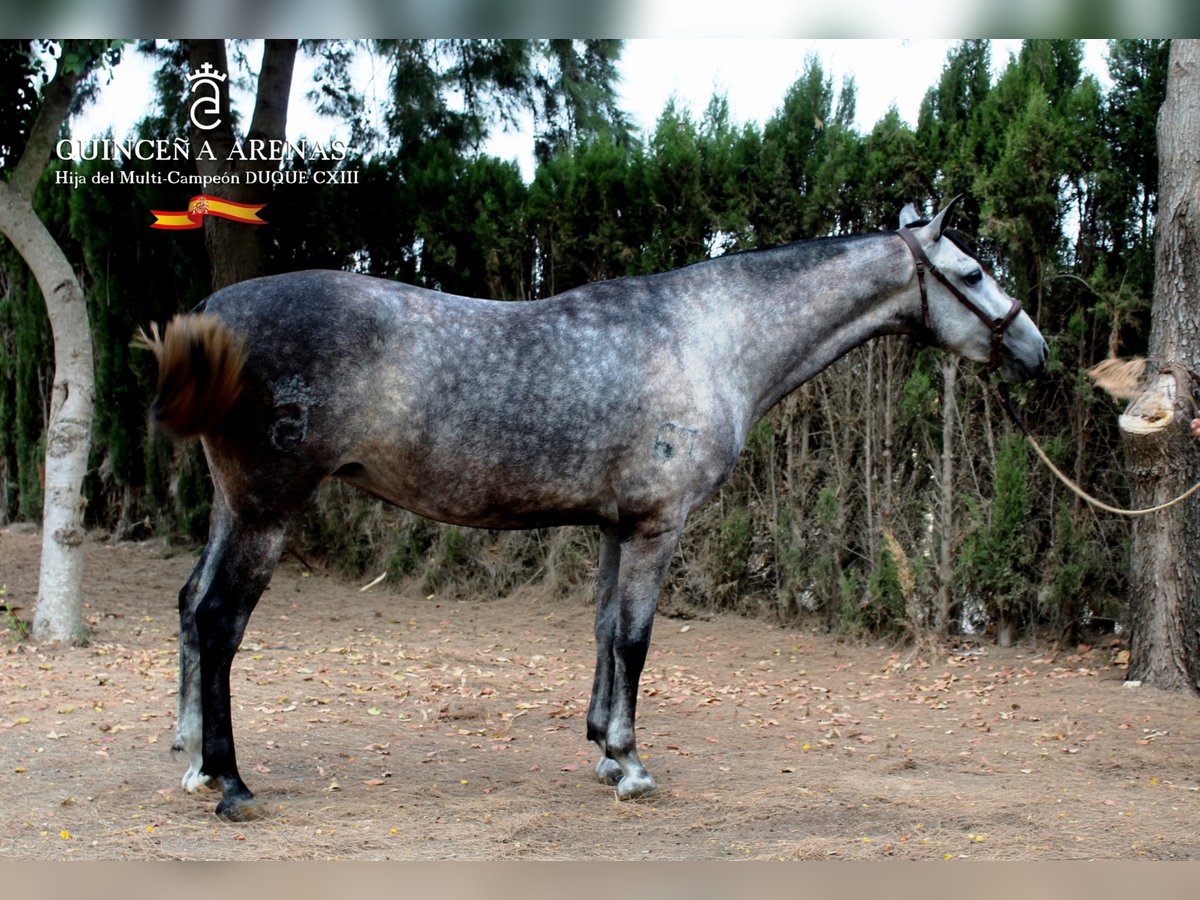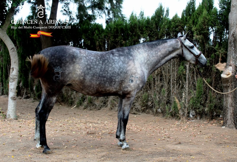 QUINCEÑA ARENAS es hija del semental más famoso de Yeguada Las Arenas (DUQUE CXIII) DUQUE CXIII es un semental multipremiado, posiblemente uno de los sementales más famosos de esta Raza, Campeón Joven de España en 2008, Campeón Absoluto de Andalucía en 2010. Semental con caso 300 crías registradas. QUINCEÑA ARENAS posee mucha raza, es una potra que se convertirá en una futura madre con grandes características para la cría.