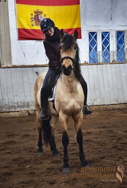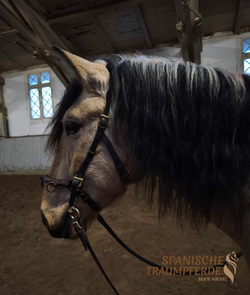 Our SERPENTINO SH is a friendly, lively, and cheerful PRE gelding who immediately captures your heart with his stunning buckskin coat, harmonious conformation, and beautiful neck. His extraordinary black legs and striking dark mane further enhance his appearance. With his loving eyes, he instantly looks into your soul, revealing his mischievous personality. SERPENTINO SH is a joyful horse with excellent, elastic movements. He is brave, curious, and eager to learn. Recently gelded by his breeder, he was lovingly introduced to work with humans and under saddle by a woman’s hand. He clearly shows that he has not had any negative experiences in his previous life. SERPENTINO SH is well-trained on the longe line and is familiar with the saddle, bridle, and rider’s weight. He is now being further developed age-appropriately to become a solid, reliable riding partner. Raised in a herd, he is a social, fair-minded horse when interacting with his peers. Here with us in Traventhal, the gelding proves to be uncomplicated, playful, and friendly. Thanks to his upbringing on spacious pastures, he has developed a solid physique and is accustomed to outdoor life in wind and weather. Videos can be found on my website: www.spanische-traumpferde.de X-rays are available. Location: 23795 Traventhal A personal meeting with SERPENTINO can be arranged almost at any time by appointment. We take sufficient time for this visit, and to protect our horses, a flat fee of €50 will be charged.