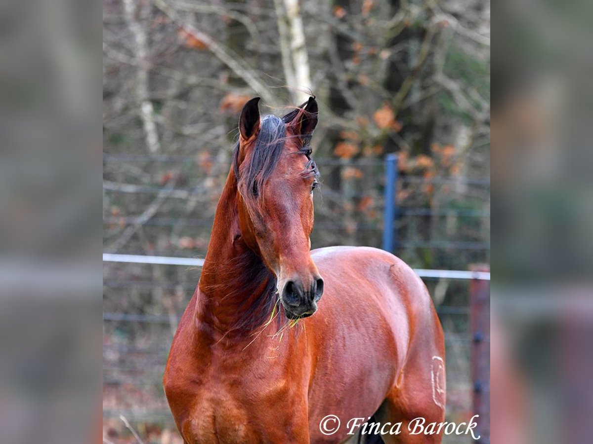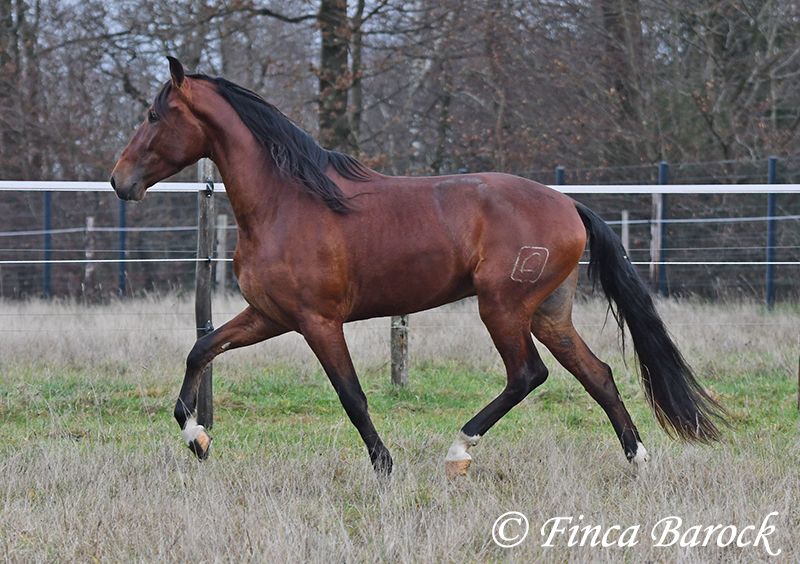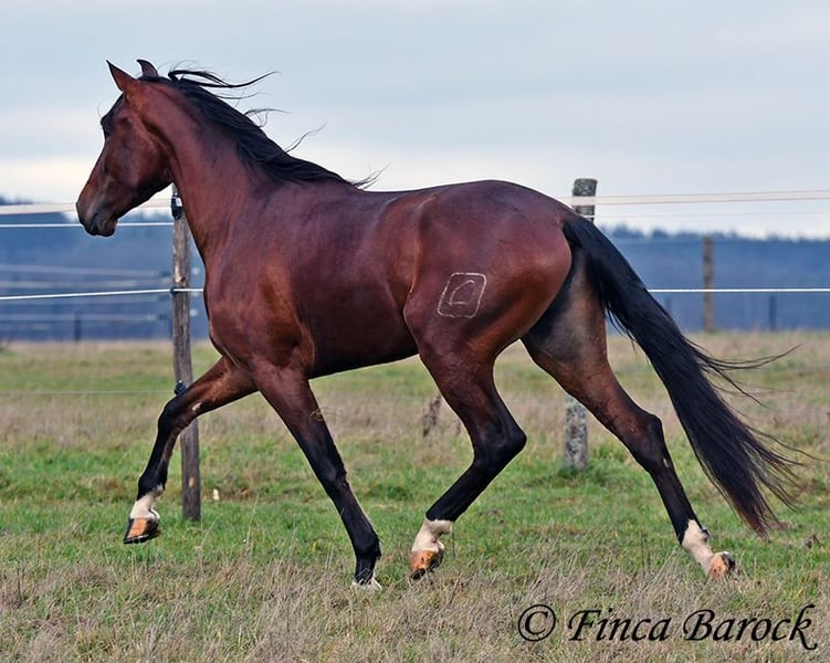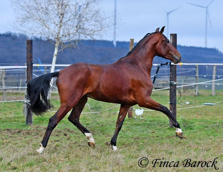 Breed: Andalusian (PRE) Name: Bandolero Gender: Gelding Height: 1.61 m (16.1 hh) Date of Birth: April 1, 2022 Color: Brown Price: €5,500 Sire: Bandolero CXXIII by Jilguero XII Dam: Manzanilla XL by Volador XIII Bandolero is a very handsome, energetic, and affectionate horse who quickly wins everyone over with his friendly nature! He has been lightly backed in the walk, trot, and canter and is a quick learner. Overall, he exudes a great natural calmness, which makes working with him even more enjoyable. He is very open to new experiences and enjoys variety. Riding without a saddle—sure! Walking over a tarp, with dogs running alongside, or passing tractors—Bandolero wants to be part of it all. He has already mastered his first trail rides and tends to be curious rather than scared when faced with "scary" objects, preferring to explore rather than retreat. Bandolero is a comfortable rider and naturally possesses a lovely uphill canter. He is still growing and will continue to develop in size. He is used to herd life, and shows playful and friendly behavior. Includes veterinary examination and X-ray images (due to an X-ray finding, he is offered at a significantly reduced price). Contact: Finca Barock, Tel. 0173-696 31 81, 56291 Wiebelsheim