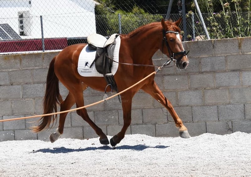 Caramelo, a true dream for girls, is our incredibly elegant and sweet Pura Raza Española gelding. This gelding, born in 2021 and in a rare chestnut color, impresses not only with his expressive appearance but also with his honest character under saddle. With a height of approximately 160 cm, he is compact and correctly built, always friendly, balanced, and people-oriented. He has full ANCCE papers and offers not only visual appeal but also riding qualities. He is well-behaved in handling, is familiar with both box and herd housing, as well as regular turnout. At the veterinarian and farrier, he is always uncomplicated. Vaccinations and deworming have been carried out. Under saddle, he presents himself as easy to ride and is always willing to learn and attentive. X-rays are available. A meet-and-greet appointment can be arranged. We will take enough time to get to know each other during this appointment.