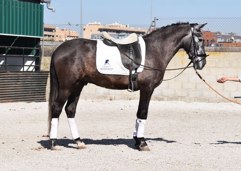 bon caractère, monté aux allures de base et en terrain, saute aussi, a déjà fait des radios, origines : Yeguada Sierra Morena, Jose Enrique Muños de Albelda www.elegante-andalusier.com