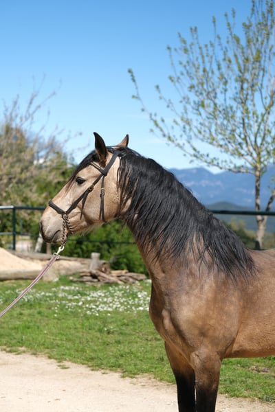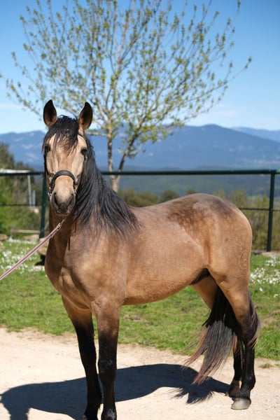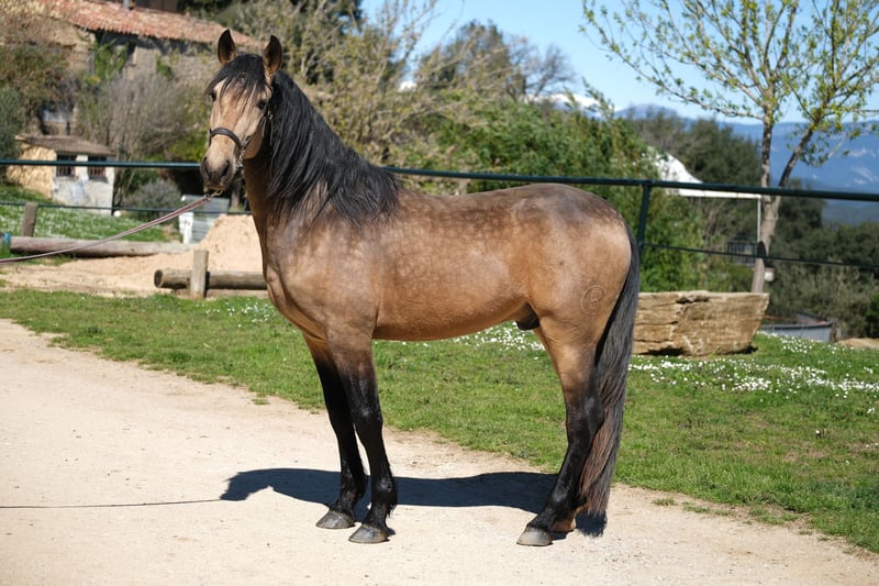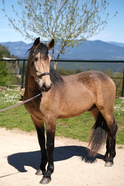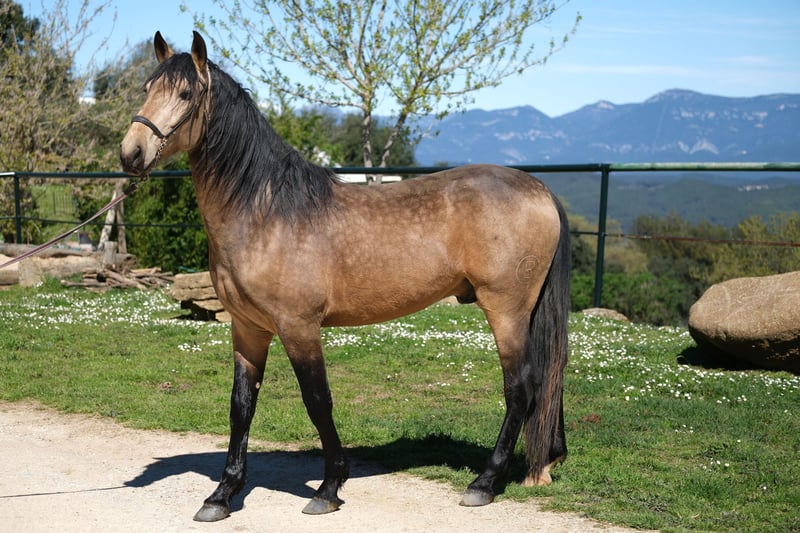 This beautiful PRE gelding is looking for his special person. He has a great presence, stunning gaits, and a very kind character. He is very polite and respectful in handling and pays attention to subtle signals, while also being brave and curious. Currently, he is 4 years old and approximately 1.62 m tall. However, he will grow taller and become more baroque, with an estimated final height of about 1.63-1.65 m. He is already under saddle, both in the arena and on trails, which he does very willingly and responds well to subtle cues. Additionally, he has also been driven and enjoys it. In the future, we can see him in various disciplines, including dressage, working equitation, shows, driving, or simply as a leisure partner. He lives in Spain with his breeder, who raises his horses with a lot of love, patience, and space. He lived with his mother and other mares with their foals in a large herd until his first year. They had a large pasture in a nature reserve with hills and rivers, allowing him to learn social skills and sure-footedness. Subsequently, he lived with other young stallions in a herd, and now he has been stabled, spending nights in a box and going out to the pasture or paddock with the herd during the day. He is a very sweet young gelding with a big heart, looking for his special person to continue his journey together. Location: Barcelona, Spain; a meet-and-greet in Spain and transport can be easily arranged.