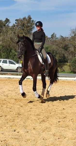 Silencio ist ein schwarzer PRE-Geländewallach im Alter von 5 Jahren, dessen Name treffend gewählt wurde, da er „Stille“ oder „Ruhe“ bedeutet. Als Fohlen war er sehr ruhig und zurückhaltend, so dass man fast meinen könnte, der Züchter hätte ihn vergessen. Natürlich lag das nicht daran, dass dieser Wallach zu unauffällig gewesen wäre. Im Gegenteil, er ist ein wunderschönes Pferd mit einer sehr typischen Erscheinung. Er war jedoch eindeutig ein Spätentwickler und war im Alter von 3 und 4 Jahren noch nicht bereit für die Arbeit. Daher wurde er kastriert und durfte zusammen mit den Absetzern und jungen Hengsten aufwachsen, bis er 5 Jahre alt war. Silenzios Blutlinien sind durch Cartujano geprägt auf der väterlichen Seite, er ist ein Enkel von Judio VII, Zuchtbulle mit über 379 Nachkommen und noch immer mit dem höchsten Koeffizienten von 1,77 für „Zuchttyp“. Die Mutterlinie führt über Educado X, einen Spitzenvererber im PRE-Bereich, der als Eliteschimmel ausgezeichnet wurde, über den nicht viel gesagt werden muss. Silencio ist somit ein sehr gelungenes Beispiel für die Verbindung alter Carthusian-Blutlinien mit modernem Einfluss durch die Mutter. Ein Wallach, der artgerecht aufgezogen wurde, Zeit zum Wachsen und Entwickeln hatte, spät eingeritten wurde und bei Röntgenbefund frei ist. Er überzeugt durch sein freundliches Wesen, seine unkomplizierte Art und sein Erscheinungsbild. Er ist ein ideales Pferd für jemanden, der mit ihm weiter wachsen möchte, da er derzeit 5 Jahre alt ist und in den Grundgangarten geritten wird.