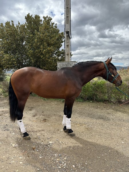 Poulain qui aura 4 ans en juillet, super caractère, très très noble, typiquement espagnol baroque, se déplaçant très bien, faisant des épaules en dedans, des cessions à la jambe, le pas espagnol presque parfait et sortant dans le champ avec une totale tranquillité, que ce soit seul ou accompagné, cheval avec un énorme potentiel.