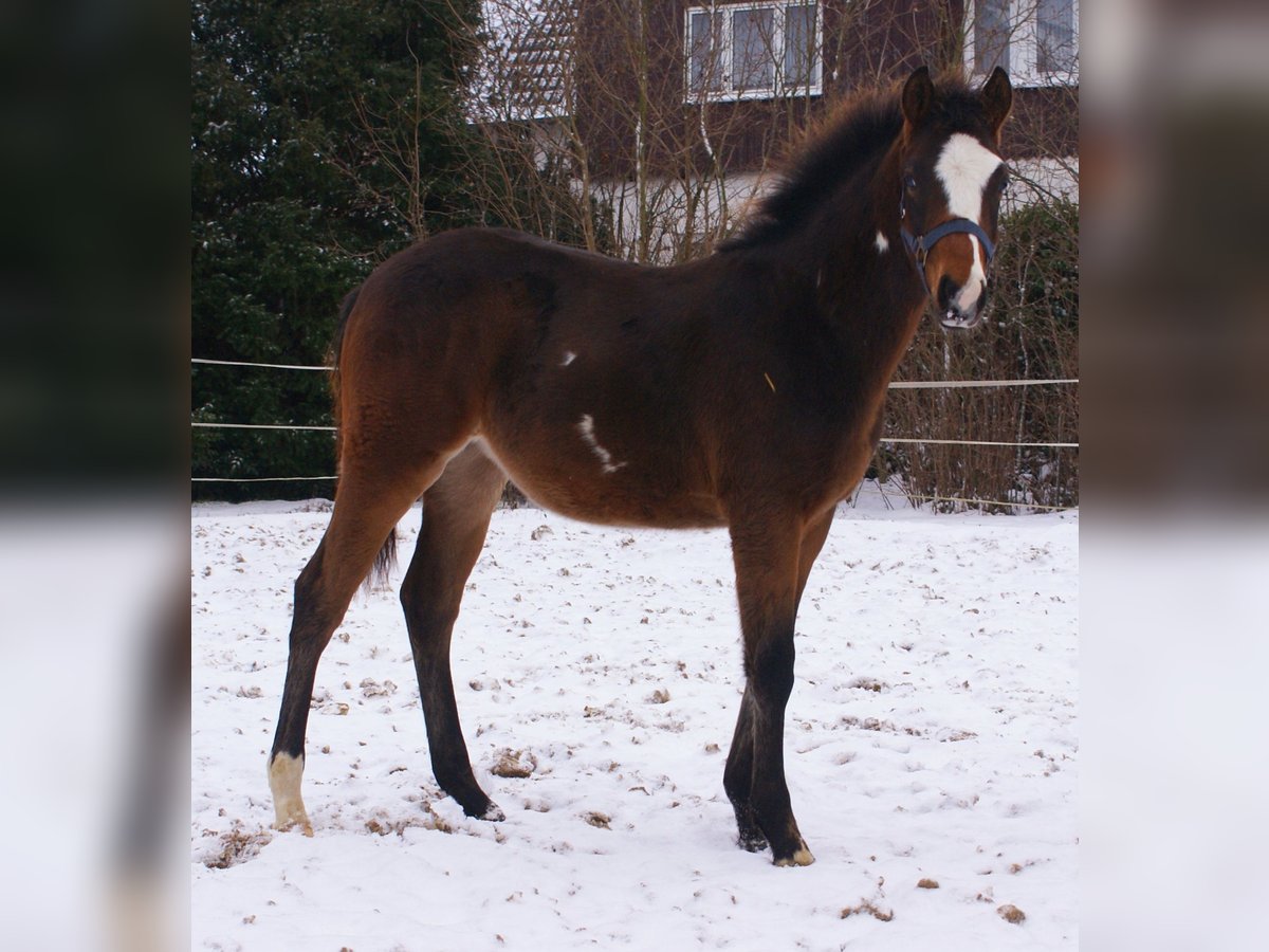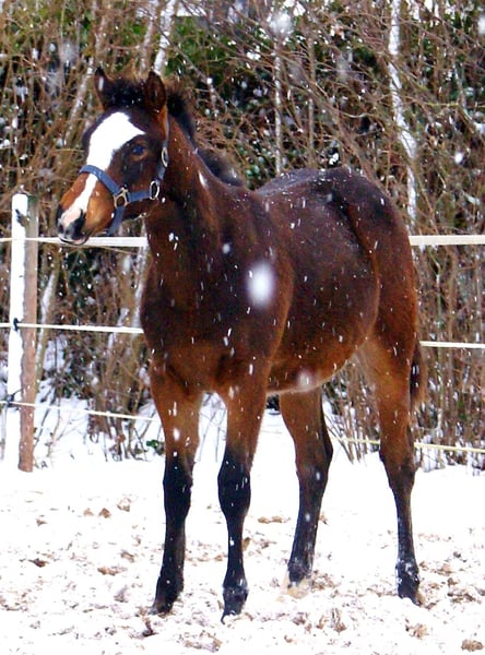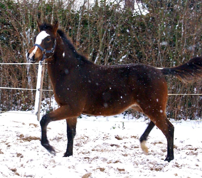 Charming Quarter Pony colt, dark bay with spots. Sire: Paint Horse Kingsley n Jills Wood; dam: German Riding Pony by Kennedy WE. He comes with full papers and a passport from the ZSSE. An outgoing little heartbreaker with a distinctive blaze, a stylish head, and a heart-shaped marking on his neck. Light-footed with large, graceful movements, elegant and agile. Suitable for dressage, and he is out of his German Riding Pony dam.