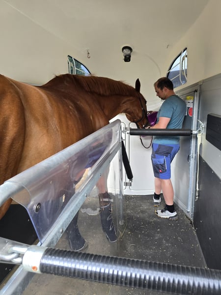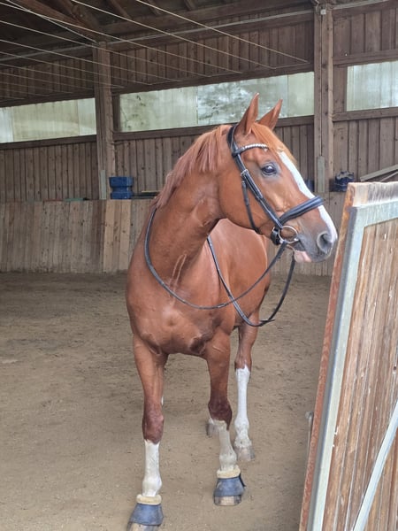 I am selling my 11-year-old Rheinländer gelding. He has been with me for five years and has mostly been ridden for leisure at home, except for one training session away. He loves going on rides, whether alone or with company, and enjoys small cavaletti jumps. Currently, he is very eager and learns quickly, especially when it comes to the beginnings of piaffe. He is well-behaved, has never bucked or reared, and even children can ride him. Warino is a rather laid-back ride and needs some motivation to work, so he is not suitable for beginners or those looking to make rapid progress in riding.