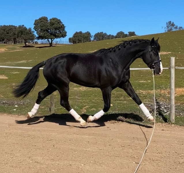 Raza: Silla Francés Fecha nacimiento: 10/01/2019 Documentación: Pasaporte equino. Sexo: Semental (aún no ha cubierto) Alzada a la cruz: 1.70 m Nivel de doma: Transiciones, cesiones a la pierna, iniciándose en el salto de obstáculos apenas lleva un mes, recorridos a 0,90. Apto para amateur y todo tipo de jinetes Precio: 15-25k Descripción: Magnífico caballo de capa negra cuatralbo y careto, con una presencia imponente y gran belleza. Destaca por su físico atlético y bien estructurado, acompañado de unos movimientos armónicos y expresivos que reflejan fuerza y equilibrio. Su mayor virtud es un galope extraordinario: amplio, cadenciado y perfectamente equilibrado, marcando muy bien los tiempos, lo que lo convierte en un caballo especialmente apto para recorridos en salto de obstáculos. Además, posee un carácter fuera de lo común. Noble, manejable y muy colaborador, es un caballo fiable y agradable de montar, apto para jinetes de cualquier nivel. Un ejemplar que combina calidad, funcionalidad y un temperamento excepcional.