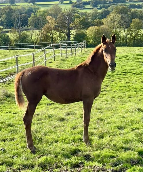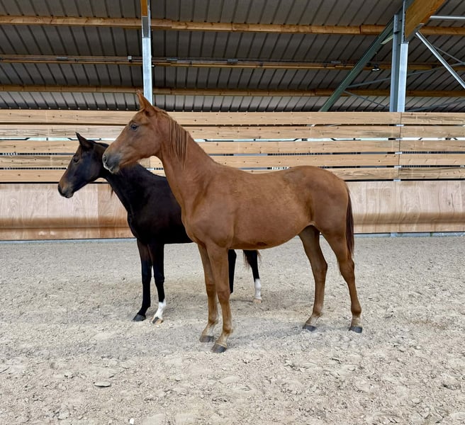 Pouliche de 2024 par Bon Cœur et Vitalis. Beaucoup de force pour cette pouliche très osseuse qui atteindra très certainement un bon 170-175cm ! Énergique et très à l’écoute, très proche de l’homme, c’est une pouliche tout en force mais d’une extrême gentillesse 🥰 Très bien manipulée, facile pour tout. 3 très belles allures avec notamment beaucoup de force dans les postérieurs au trot !