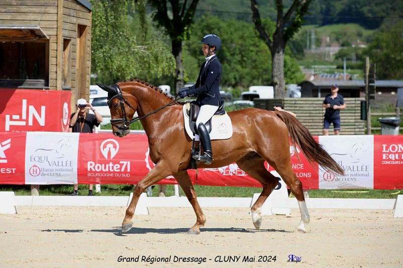 Lasco Mill d’Arx is a striking gelding, captivating with his natural elegance and presence. Standing at 16.1 hh, with a strong back and expressive gaits, he exudes both power and ease. Beneath his charismatic exterior, he reveals himself as a generous, attentive, and willing horse who consistently gives his best during every session. He is a reliable partner who has already demonstrated his consistency in competition, while still offering room for growth to support a rider’s development. **Sire:** London Swing KWG (by Londonderry) – A well-known stallion renowned for passing on suppleness, elegance, and strength, highly appreciated in dressage. **Dam Sire:** Rascalino (by Rotspon) – A solid dam line celebrated for consistency, reliability, and quality movement. In work, he impresses with his three expressive gaits, notably a large, ground-covering walk rated 9/10 in the Free Walk. He is diligent in lateral movements (shoulder-ins, leg-yields), progressing in piaffe steps, and beginning to diagonalize into piaffer. His powerful back allows him to lower himself naturally, facilitating collection and more technical exercises. Versatile and curious, he is capable of completing small jumping courses with the same seriousness and eagerness to perform well. Lasco already boasts a commendable competition record: - At 4 years old, he participated in the 1st year of the Free Walk cycle (6 outings). - At 5 years old, he completed 8 outings with scores up to 83%, reaching the finals at Fontainebleau and earning an Excellent rating (8th place in the Championship). - At 6, he competed up to Amateur 2 level, with scores around 72.8%. - At 7, he confirmed his potential in Pro 3, with three wins and consistent scores around 68%. In every outing, he demonstrates a stable mindset, excellent concentration, and great generosity. Lasco combines the friendly temperament of a trustworthy horse with the natural energy needed to progress in dressage. Easy to care for and ride, he is confident on solo hacks (even among cattle), loads effortlessly, and travels well both in a trailer and a van. He offers a light, pleasant contact without requiring excessive force, making him an ideal partner for amateurs, even those of larger stature, seeking a secure yet comfortable ride. Lasco has been under serious veterinary supervision, with all radiographs and veterinary reports available upon request (2021 and 2024). - Reliable and generous temperament - Experienced and successful in competition - Expressive gaits, with an exceptional walk - Easy to ride - Versatile and practical for daily use An excellent opportunity for an amateur rider looking for a trustworthy, competitive, and enjoyable dressage partner.