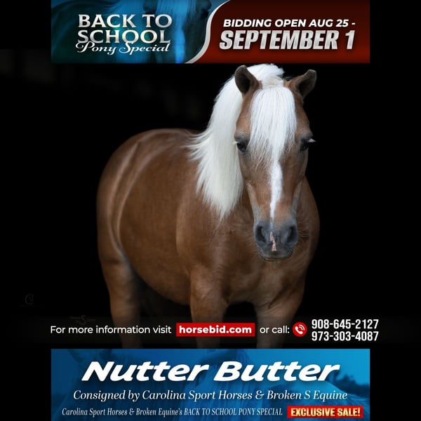 𝐂𝐚𝐫𝐨𝐥𝐢𝐧𝐚 𝐒𝐩𝐨𝐫𝐭 𝐇𝐨𝐫𝐬𝐞𝐬 & 𝐁𝐫𝐨𝐤𝐞𝐧 𝐒 𝐄𝐪𝐮𝐢𝐧𝐞'𝐬 📚𝑩𝒂𝒄𝒌 𝒕𝒐 𝑺𝒄𝒉𝒐𝒐𝒍 𝑷𝑶𝑵𝒀 𝑺𝒑𝒆𝒄𝒊𝒂𝒍📚 Happening now thru MONDAY | SEPTEMBER 1st - Available EXCLUSIVELY on HorseBid's website! For more details and to register visit: www.Horsebid.com CONSIGNOR CONTACT: Carolina Sport Horses & Broken S Equine Kieran 908-645-2127 or Beau 573-303-4087 LOCATION: Clover, SC BREED: Shetland REGISTERED: No COLOR: Palomino HEIGHT: 10 AGE: 13 GENDER: Gelding Nutter Butter is a 13 year old Shetland gelding standing 10 hands tall. Everyone who meets this pony absolutely loves him, if you watched his video you will see why! He is a confidence builder to a T, a reliable parter, and every kids best friend. He has come along with us to do all the jobs on the ranch, standing patiently with the kiddos, keeping them safe and entertained all day long. Whether your kids want to dress him up like a princess, braiding his hair and painting his hooves, or play cowboy shooting pop guns and chasing goats around the pasture - Nutter Butter is happy to babysit in exchange for some carrots and a back scratch. Nutter Butter has been known to put a smile on even the grumpiest kids face, whether you are in the saddle, going for a ride in his cart, or snuggling him on the ground. He rides and drives the best! He can follow along, or be ponied along, on the trails, ride into town, and will drive absolutely anywhere. He is traffic safe, and can be driven even by the youngest kids. He lives outside in a mixed herd, is easy to catch, and is an easy keeper. Nutter Butter has been a tried and true member of our family, and has been enjoyed by our kids, their friends, and families. There’s nothing not to love about him, and we can’t wait to see the smiles he brings to his new family for years to come! Clean recent vet check on file