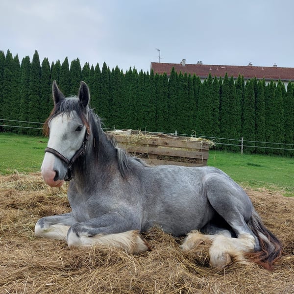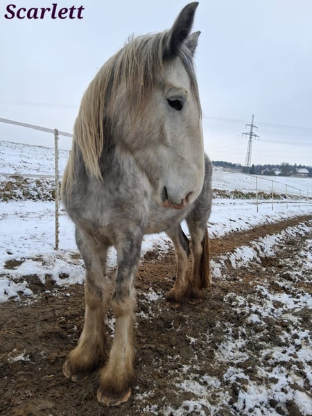 SCARLETT Scarlett was born in March 2021 and is a beautiful Shire Horse mare of the old breeding line type. Due to her lineage, she promises to be an impressive representative of the Shire Horse breed. Both of her parents are large, sturdy, very people-oriented, and friendly in character. Scarlett is also very people-oriented, affectionate, and gentle in handling due to her past. Daily interactions with her are completely uncomplicated. Leading, tying, grooming, picking up hooves, veterinary visits, loading onto a trailer, etc., have all been going smoothly so far. However, she is often a bit skeptical of unfamiliar things at first. She seems to have inherited this from her mother, who is very safe to handle but initially observes everything and everyone with a critical eye. Scarlett currently lives in a loose housing system with other Shires of different ages and has shown herself to be healthy and robust so far. Of course, Scarlett is vaccinated and is regularly dewormed. Additionally, she has full papers from the English Shire Horse Society. This means that she could later be used as a breeding mare according to the guidelines of the English Shire Horse Society. Next year, Scarlett will turn 5 years old. This means she can now be gently prepared for training next year through groundwork, walks, and in-hand training, etc. Those who are considering starting their future life horse themselves and have the necessary time to grow together will find a perfect partner in Scarlett. Our animals are only placed in the best hands and an age-appropriate home, so it is important for us to take enough time for interested parties. It is also important to us that the horse has a say in the decision, as the chemistry must also be right for our animals. We would also like to mention that we have a network of professional transport companies and are happy to provide recommendations if needed. A meeting with Scarlett can be arranged very gladly. If interested, we would be happy to schedule a joint appointment so that a mutual acquaintance can take place in a calm and stress-free manner. We kindly ask for written communication via inquiry/email/WhatsApp in advance, as we have set our phone to silent in the stable and would like to get back to you as soon as we have "horse-free" time. We will then get back to you as soon as time allows, but we ask for your understanding that the care of our horses may lead to a response taking a little longer. However, we are committed to getting in touch with interested parties as quickly as possible. By the way, the photos clearly show the typical color change of the gray horse. However, Scarlett can be seen in all the pictures :-) Further impressions of our horses can also be found on our WhatsApp channel. If interested, we would be happy to send you the link. We look forward to hearing from you regarding Scarlett.