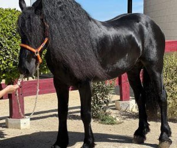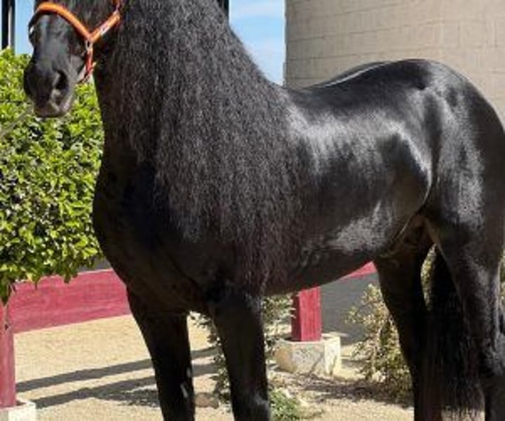 Impressive Friesian with a Flamenco Soul This magnificent Friesian horse surprised us so much that we couldn't help but show him to you! Raised from foal by his owner, who pampered and cared for him like his own child, this Friesian is the pure expression of connection and affection. Imagine a horse that not only impresses with his allure and natural elegance, but also carries the rhythm and soul of flamenco in his heart. When his owner sings to him, this Friesian transforms, performing a piaffe which looks more like a flamenca dance. It is a spectacle to see him interpret each measure with his movements, as if the music and him were one. But he doesn't just make a piaffe automatic… he also controls, very easily, the passage, the Spanish walk and the levade. This Friesian is not just a horse; he is an artist, a dancer who found his purest form of expression in flamenco. In addition, he has participated in numerous events and regularly ventures outdoors, which means that nothing surprises or frightens him. The relationship he shares with his owner is worthy of admiration, a bond forged in love and music, making this Friesian a star not only on stage but also in the hearts of those who know him. Can you imagine sharing unique moments with this Frisian? He is not only intended for those looking for a horse for shows, but also for those who want to experience the deep bond that is created between a horse and its owner through art and passion. Contact us to discover how this impressive Frisian with a flamenco soul can light up your life and fill it with music and beauty. Don't miss the opportunity to meet this exceptional being!