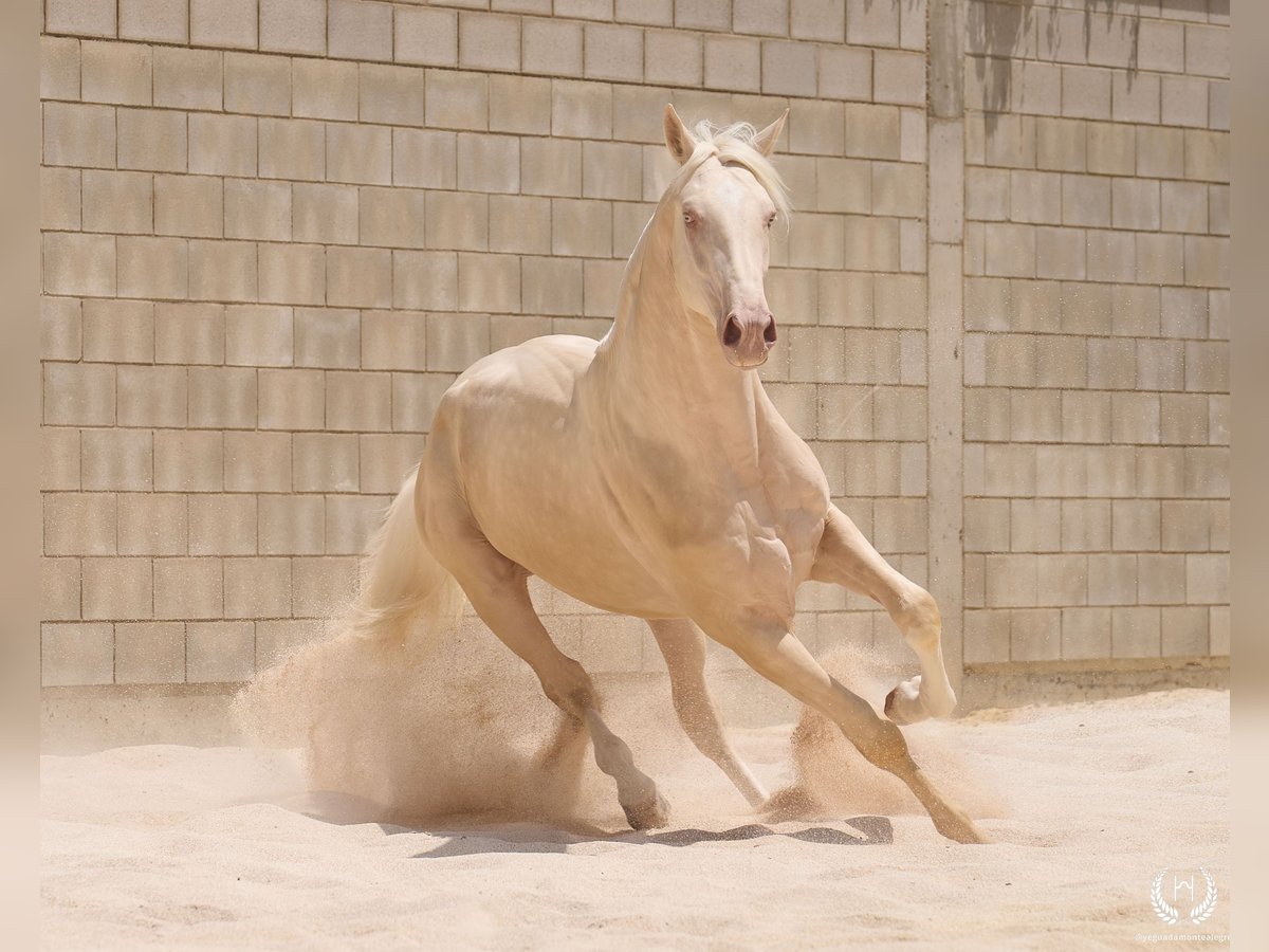 📅 21/04/2023 – CDE registered with ANCADES 🐴 A unique and exceptionally beautiful cremello colt, harmonious and powerful, with three high white socks and sky-blue eyes. Current height: 1.70 m | Expected final height: 1.72 m – 1.75 m Three-white cremello, blonde mane and tail | Excellent conformation, strong back, prominent withers and explosive movement. 🧬 Elite genetics Son of Quest of Gold (palomino CDE) – Las Regueras bloodline Grandson of Quatercream IE x Quarterback | Granddam: Eva, Polish palomino warmblood Cremello genetics (ee CRCR) GUARANTEES → 100% dilute-coloured offspring • With solid mares: palomino, buckskin, smoky black • With dilute mares: cremello, perlino, smoky cream 🧠 Excellent character & handling Basic training: lunging in all three gaits, both reins Easy to handle, good for the farrier, loads and travels well Entire colt with a calm, social and adaptable temperament – never covered 🎯 Versatility & movement Ideal for dressage, show jumping or sport use Big, elastic gaits with good projection A functional young horse with presence, balance and natural nobility ✅ Health guaranteed Excellent pre-purchase X-rays | Veterinary examinations accepted ✈️ National and international transport with professional companies. 📲 Direct contact: +34 639 522 420 📷 Photography: @almarevisual