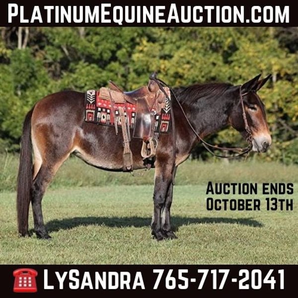 ONLINE AUCTION Place your bids at www.PlatinumEquineAuction.com Starting Bid $3500 Auction ends October 13th, 2024 Need a new saddle? Check out White Rock Saddles on our website or Facebook! Take a look at Abby who is a one of a kind mule! Abby stands around 15h, she is a 11 years old and is a Mare mule. Abby truly is a do it all kind of mule! She has been camping and riding in several states, she knows all about those rough rocky trails and knows how to handle herself. She has been on the steepest slopes, in deep creeks, over downed trees, and over all types of rough terrain while still being sure footed. She has been rode in traffic, and is very traffic safe around cars, semi, log, and dump trucks. Abby has been ridden around the ranch. She has herded and sorted calves. Abby has been roped/doctored off of as well. If you need a smooth ride that won’t hurt your back??? Then look no further as Abby has a smooth gait and can really cover the ground when asked! She will lope off good and takes her leads. She does great out in the pasture with our mixed herd. She has a great attitude about whatever she is asked to do. Whether its trails or ranch work, Abby will get the job done! Feel free to call Lucky 13 Equine Lysandra 765-717-2041 with any questions. Located in Brodhead, KY. ONLINE AUCTION Place your bids at www.PlatinumEquineAuction.com Starting Bid $3500 Auction ends October 13th, 2024 Need a new saddle? Check out White Rock Saddles on our website or Facebook!